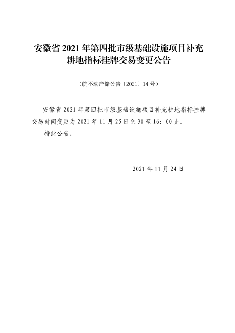 安徽省2021年第四批市级基础设施项目补充耕地指标挂牌交易变更公告