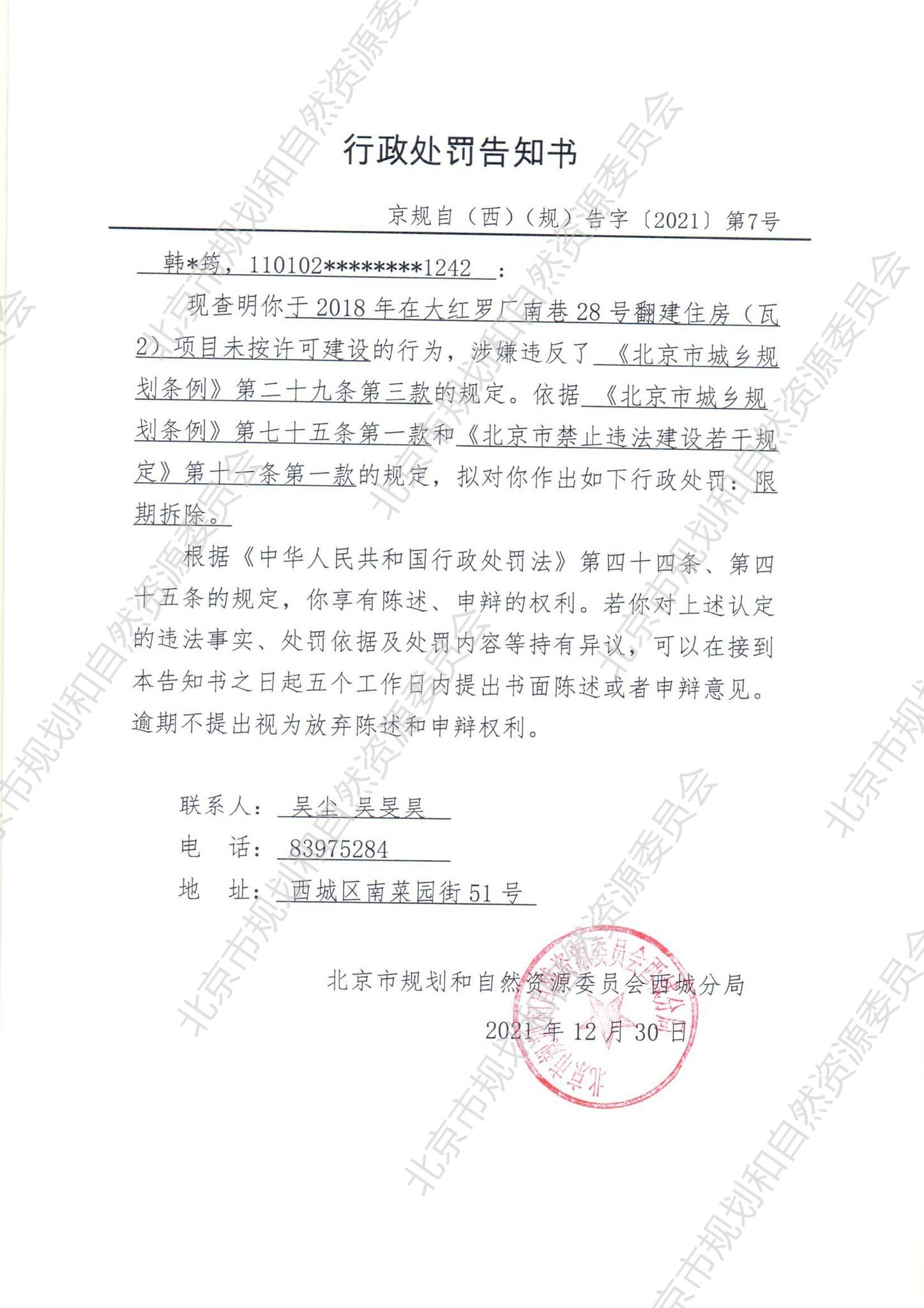 行政处罚告知书公告-京规自(西)(规)告字〔2021〕第7号