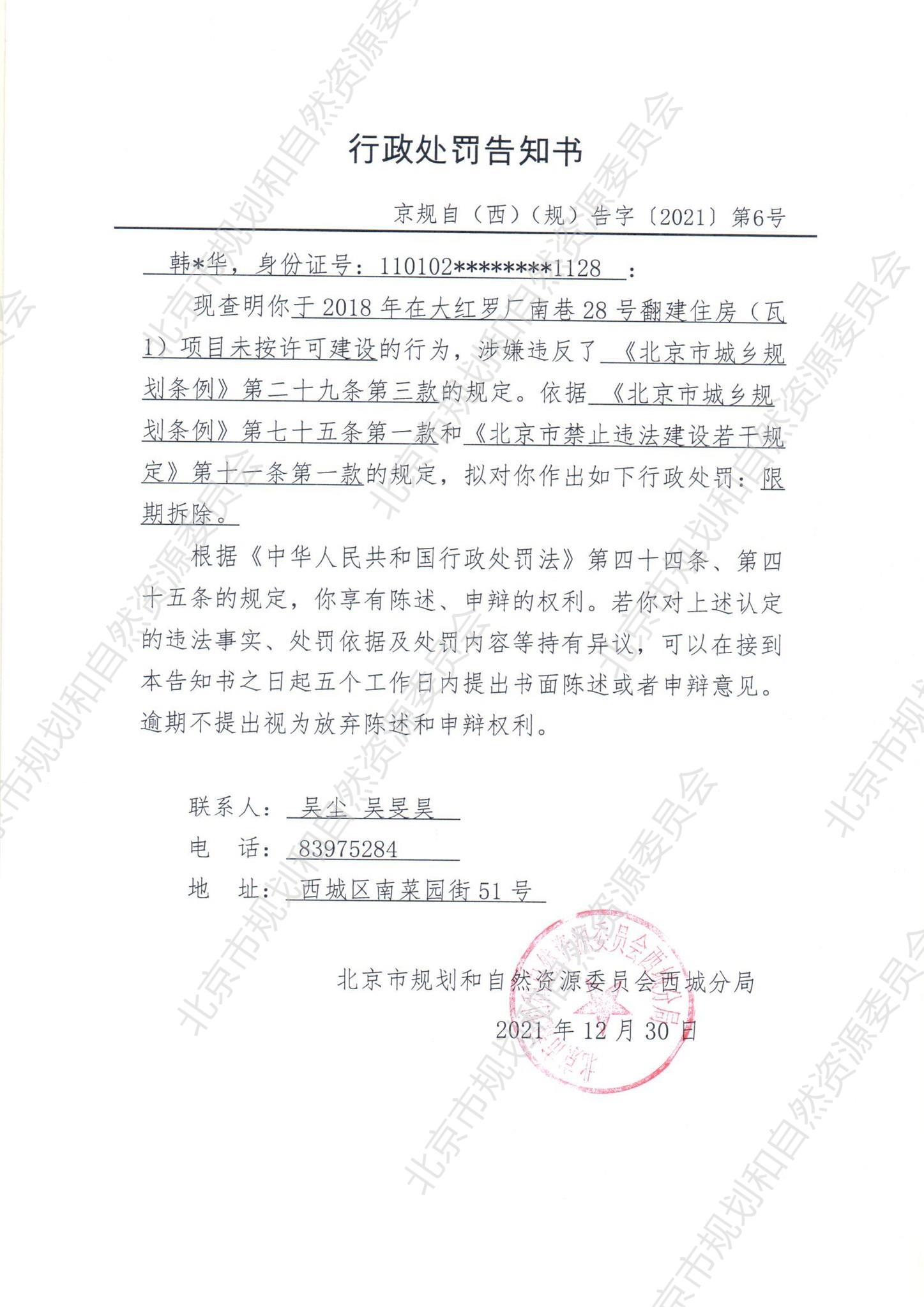 行政处罚告知书公告-京规自(西)(规)告字〔2021〕第6号