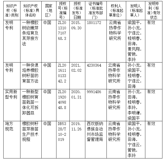 4.项目获授权发明专利2件、实用新型专利1件;制定西双版纳州地方规范1项;发表学术论文25篇,获西双版纳州科技进步奖二等奖1项、三等奖1项。橡胶树籽苗芽接规范化生产技术作为云南农垦主推技术在云南省热区“十三五”、“十四五”期间推广应用,2020—2021年期间应用单位使用本技术生产推广籽苗芽接苗共计431万株,每亩按定植33株计,累计种植面积13.06万亩,每株籽苗芽接苗按10元计,产值为4310万元,经济、社会效益显著,实现了云南省橡胶树籽苗芽接苗的规范化、规模化、简约化生产,推动了云南省橡胶树种植材料更新换代,筑牢了天然橡胶产业发展基础,促进了天然橡胶产业可持续发展,为云南热区边疆稳定、农民增收、企业增效等方面做出了重要贡献。