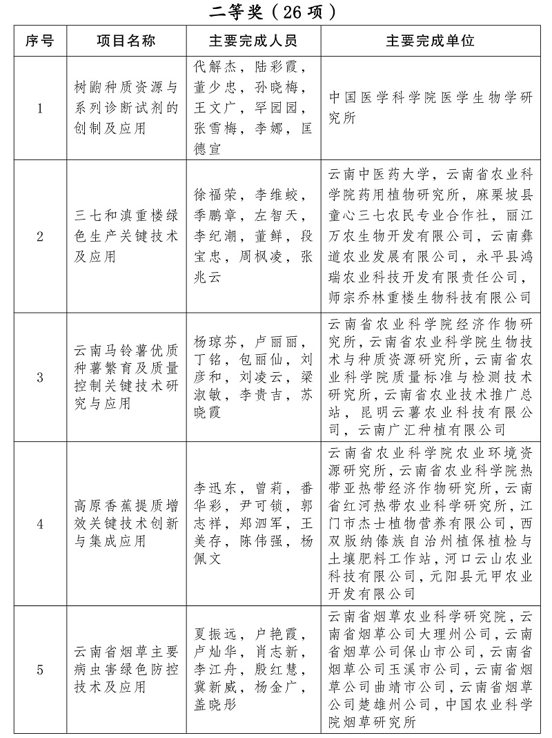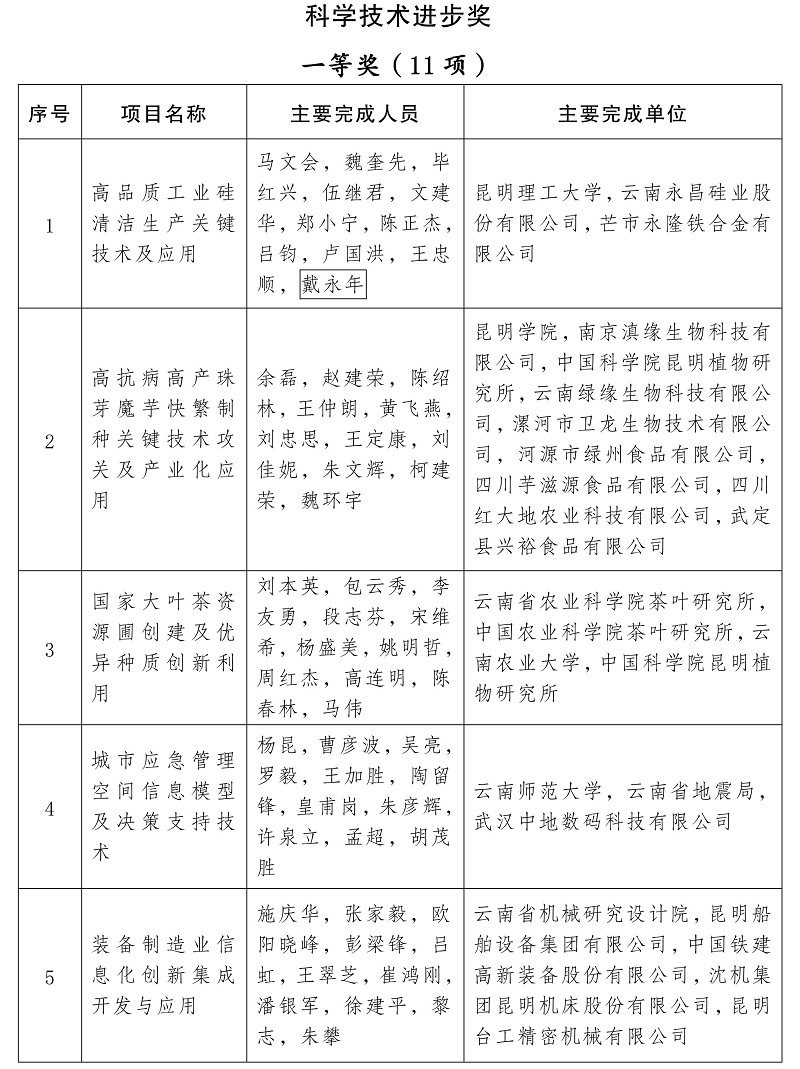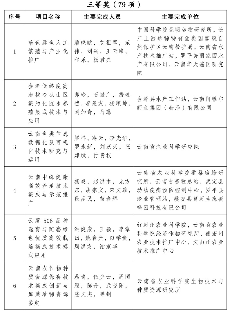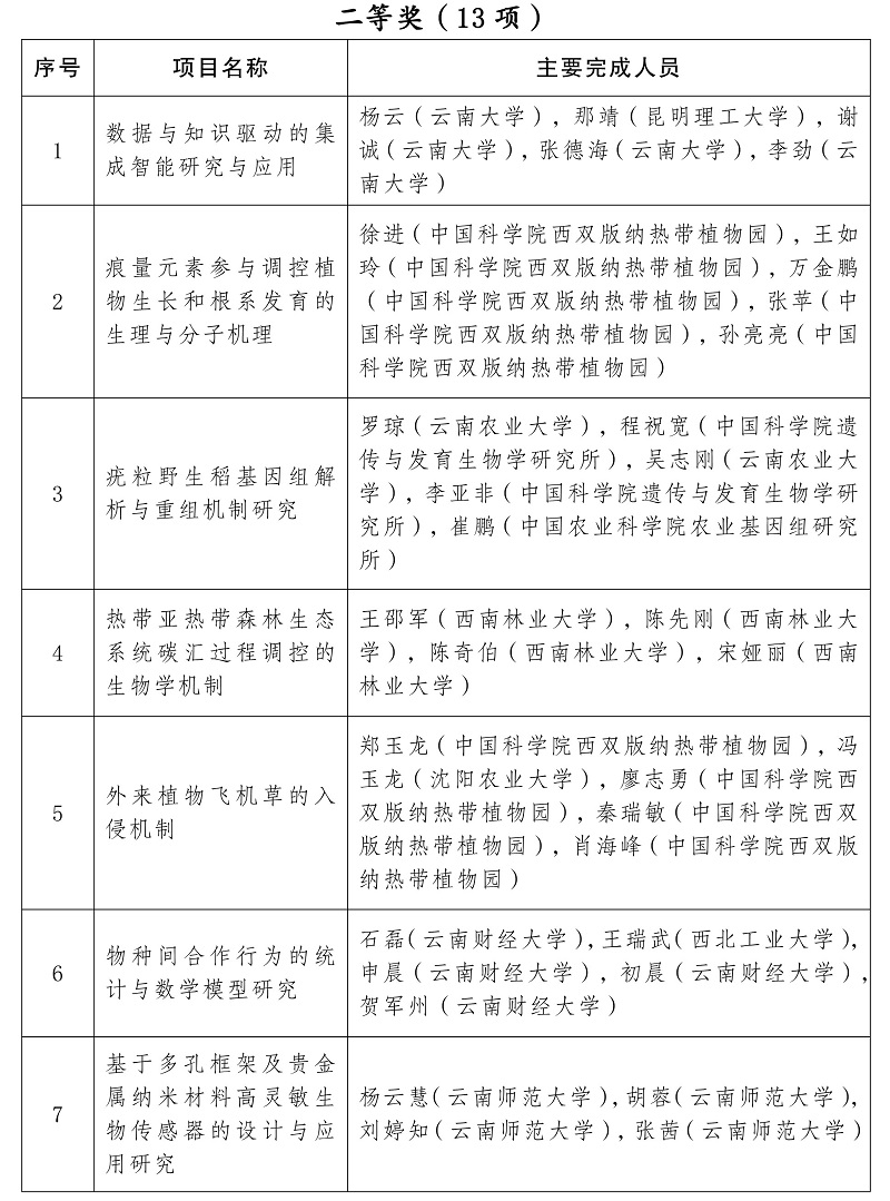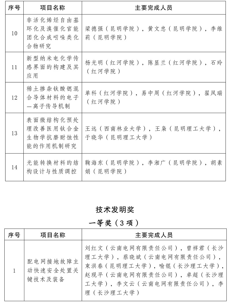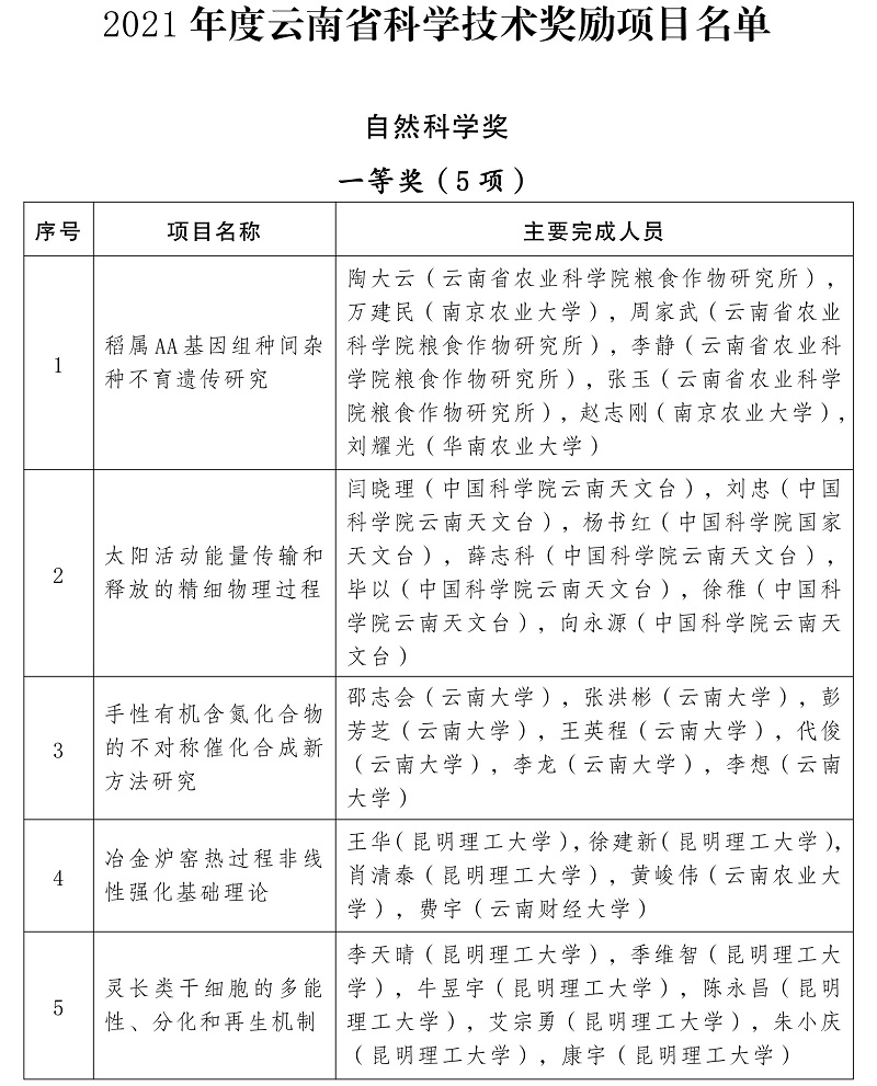 根据《云南省科学技术奖励办法》规定,经组织专家评审、省科学技术奖励委员会审定,省人民政府批准,授予“稻属AA基因组种间杂种不育遗传研究”等5项成果云南省自然科学奖一等奖,授予“数据与知识驱动的集成智能研究与应用”等13项成果云南省自然科学奖二等奖,授予“乳腺癌异质性的分子机制研究”等14项成果云南省自然科学奖三等奖;授予“配电网接地故障主动快速安全处置关键技术及装备”等3项成果云南省技术发明奖一等奖,授予“垂直差异显著区无人机遥感系统研发与应用”等2项成果云南省技术发明奖三等奖;授予“高品质工业硅清洁生产关键技术及应用”等11项成果云南省科学技术进步奖一等奖,授予“树鼩种质资源与系列诊断试剂的创制及应用”等26项成果云南省科学技术进步奖二等奖,授予“暗色唇鱼人工繁殖与产业化推广”等79项成果云南省科学技术进步奖三等奖。