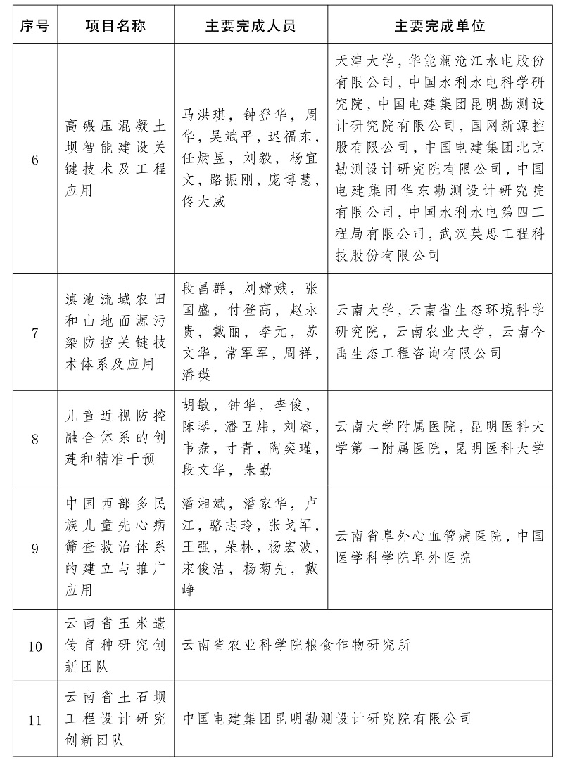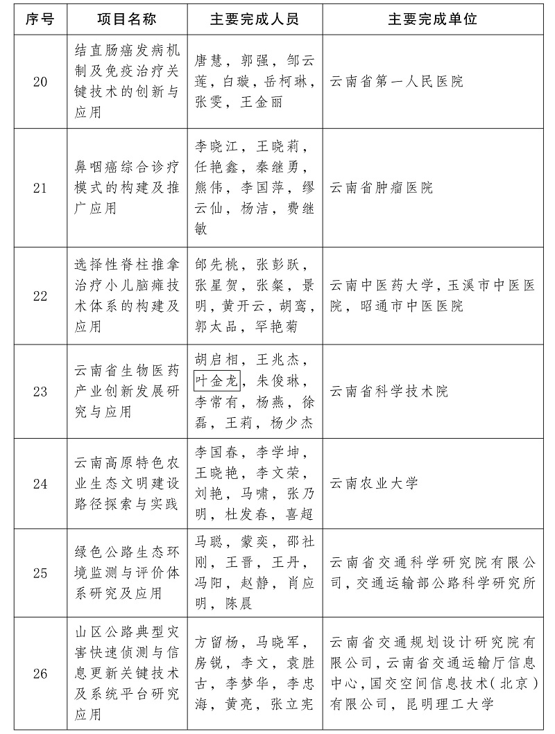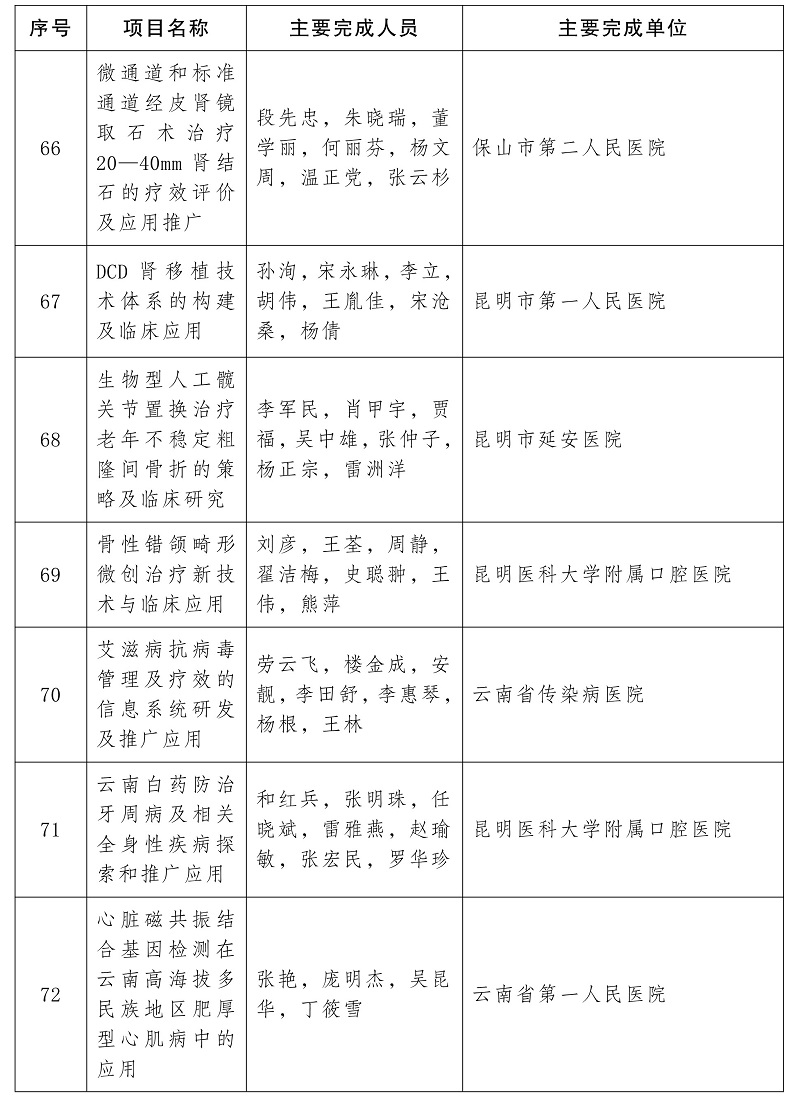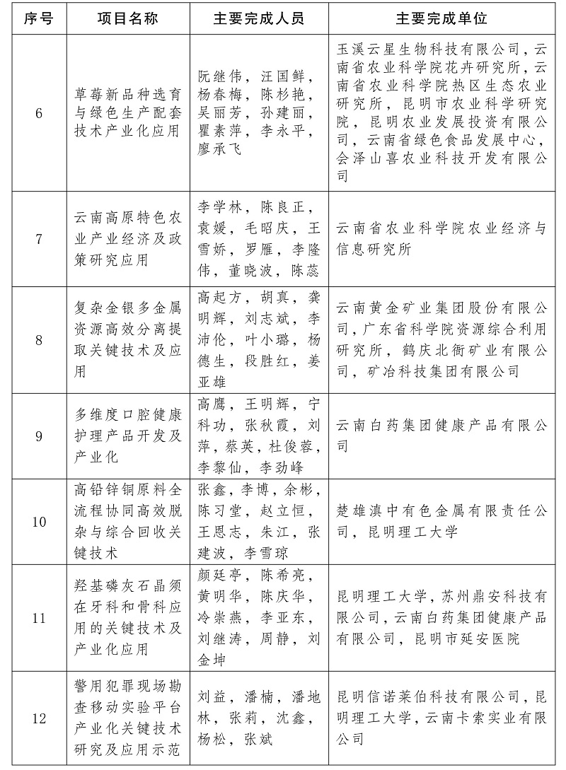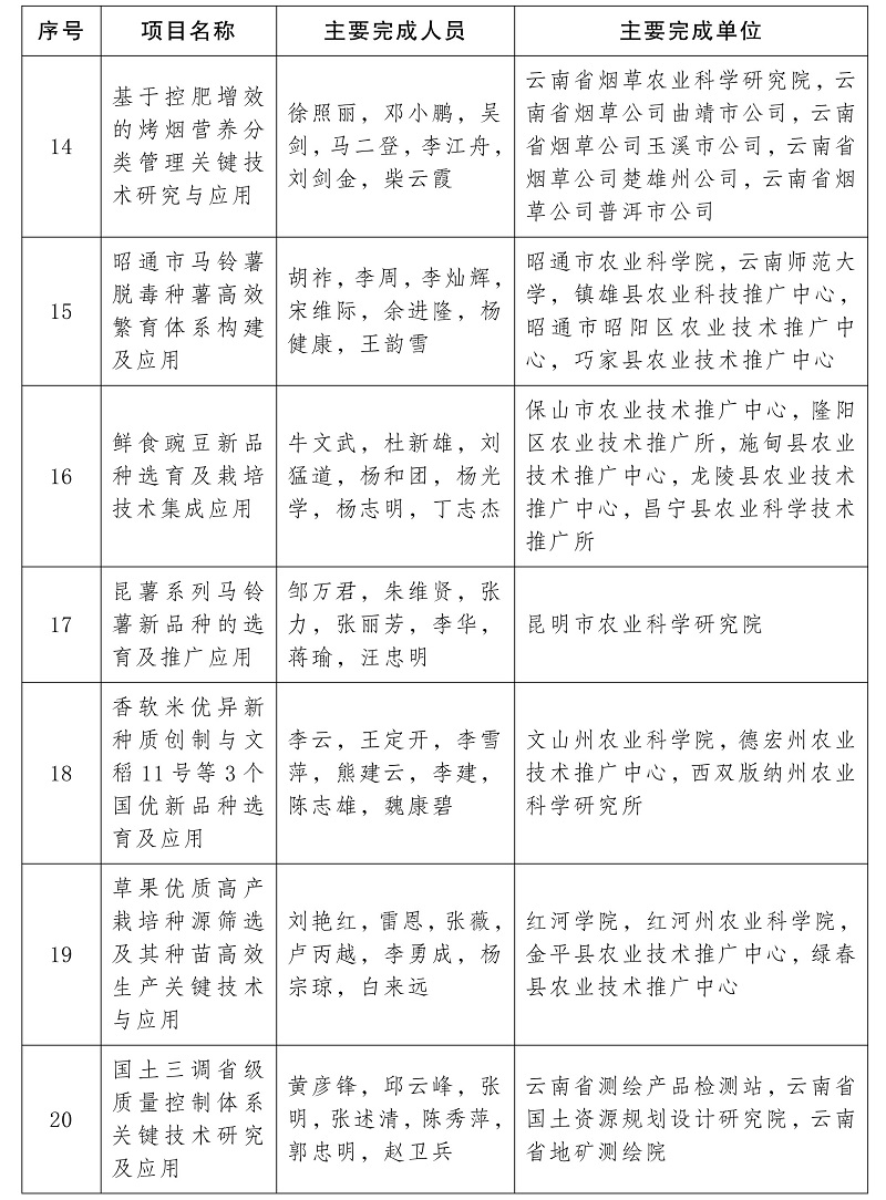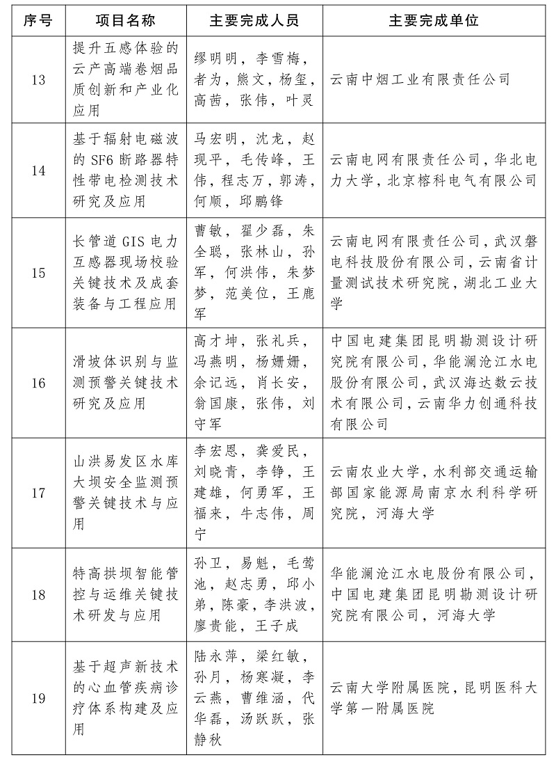根据《云南省科学技术奖励办法》规定,经组织专家评审、省科学技术奖励委员会审定,省人民政府批准,授予“稻属AA基因组种间杂种不育遗传研究”等5项成果云南省自然科学奖一等奖,授予“数据与知识驱动的集成智能研究与应用”等13项成果云南省自然科学奖二等奖,授予“乳腺癌异质性的分子机制研究”等14项成果云南省自然科学奖三等奖;授予“配电网接地故障主动快速安全处置关键技术及装备”等3项成果云南省技术发明奖一等奖,授予“垂直差异显著区无人机遥感系统研发与应用”等2项成果云南省技术发明奖三等奖;授予“高品质工业硅清洁生产关键技术及应用”等11项成果云南省科学技术进步奖一等奖,授予“树鼩种质资源与系列诊断试剂的创制及应用”等26项成果云南省科学技术进步奖二等奖,授予“暗色唇鱼人工繁殖与产业化推广”等79项成果云南省科学技术进步奖三等奖。