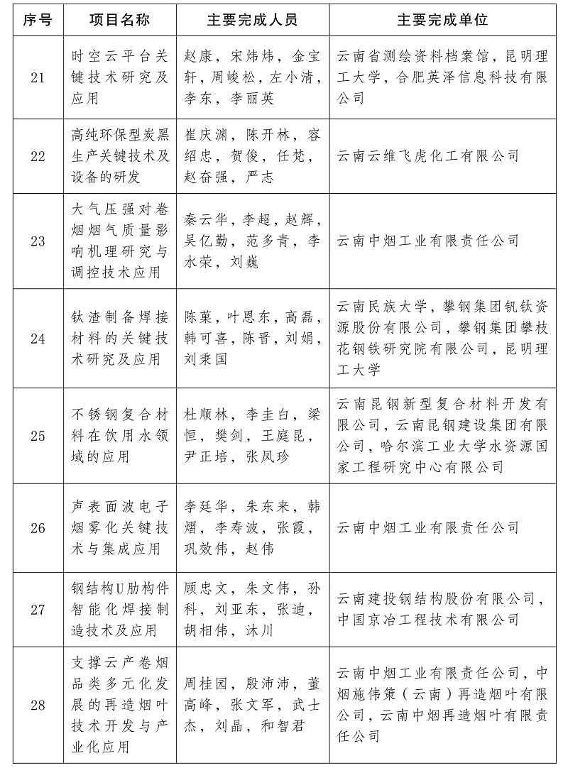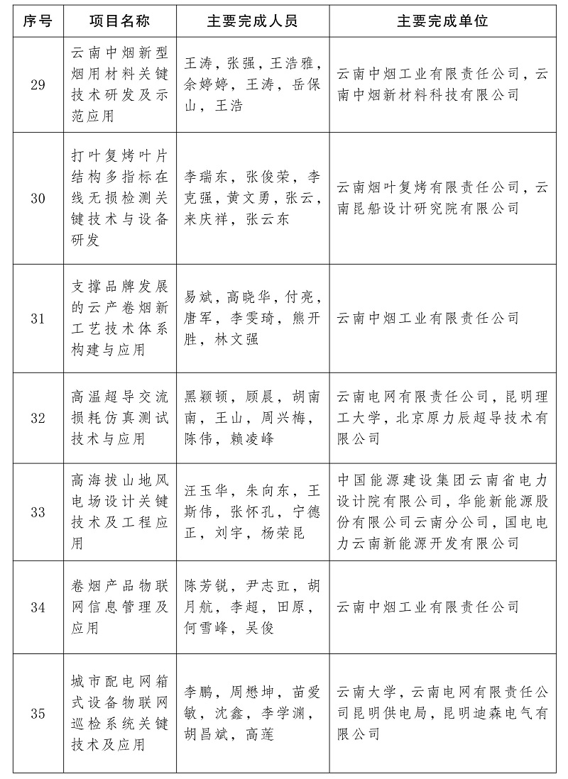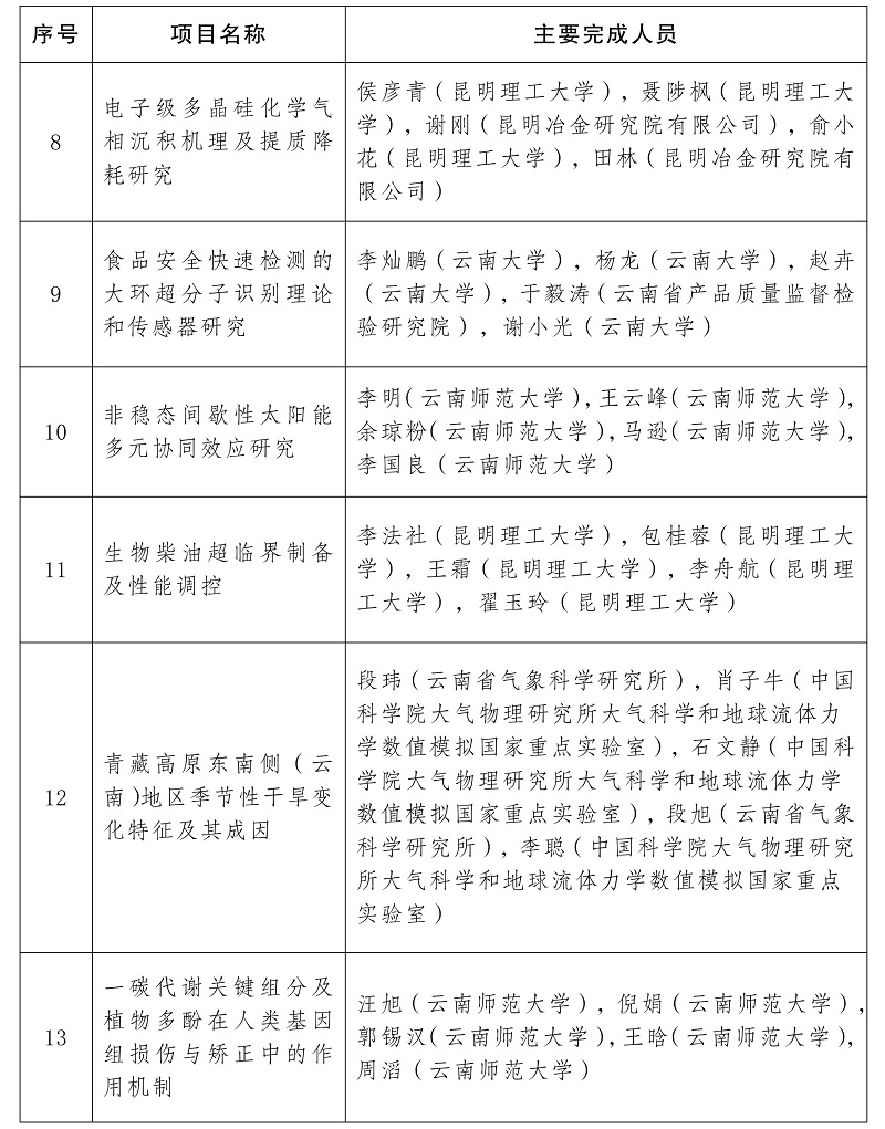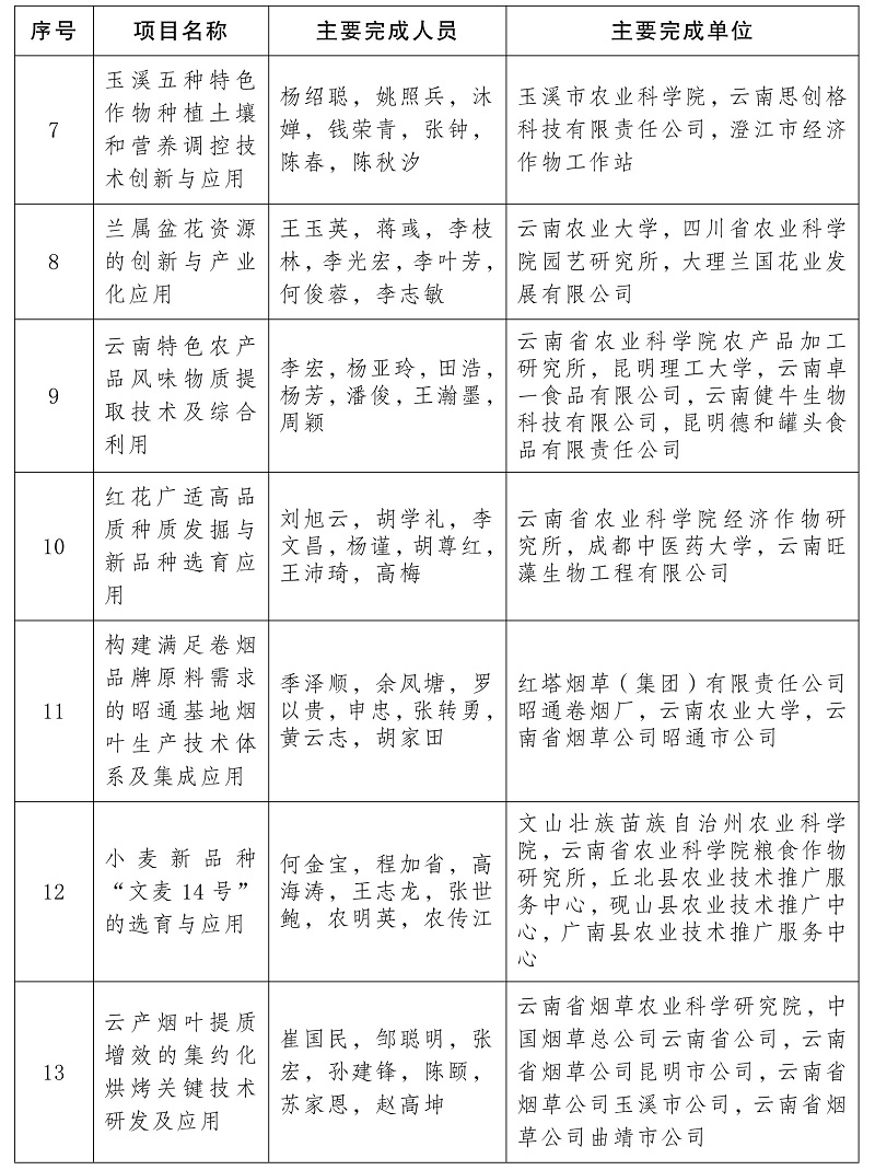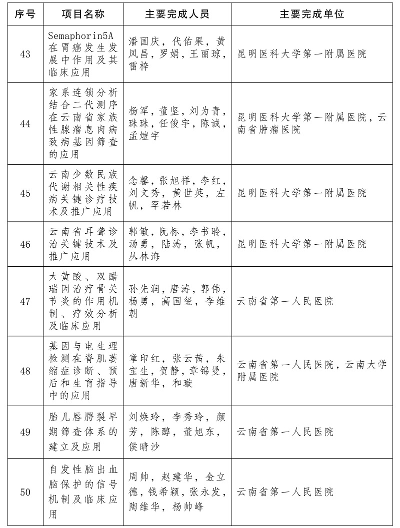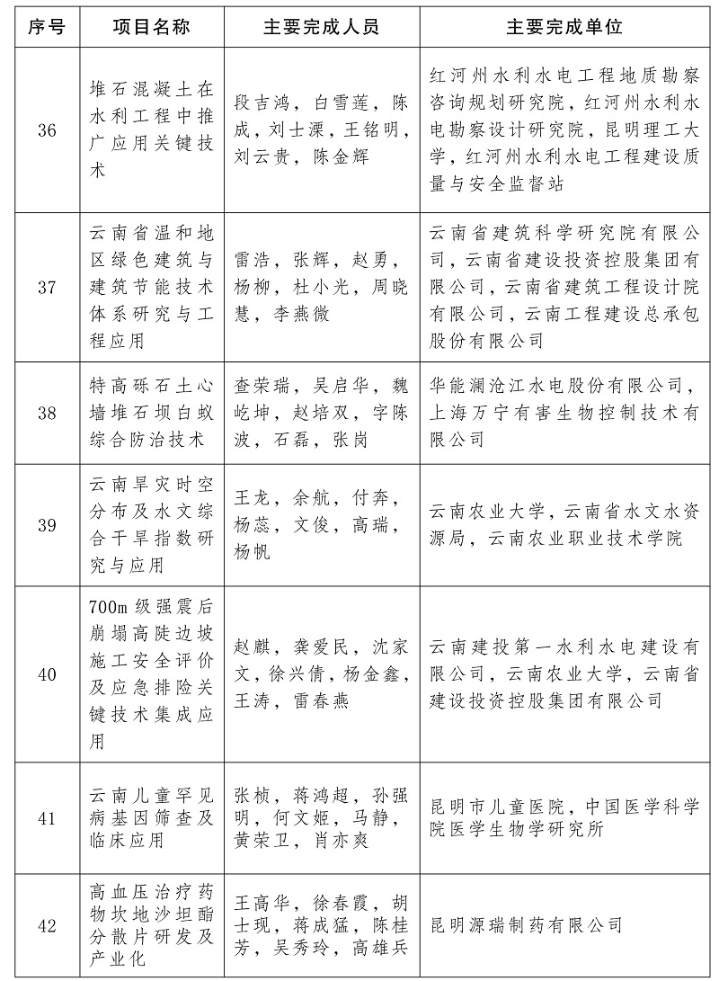 根据《云南省科学技术奖励办法》规定,经组织专家评审、省科学技术奖励委员会审定,省人民政府批准,授予“稻属AA基因组种间杂种不育遗传研究”等5项成果云南省自然科学奖一等奖,授予“数据与知识驱动的集成智能研究与应用”等13项成果云南省自然科学奖二等奖,授予“乳腺癌异质性的分子机制研究”等14项成果云南省自然科学奖三等奖;授予“配电网接地故障主动快速安全处置关键技术及装备”等3项成果云南省技术发明奖一等奖,授予“垂直差异显著区无人机遥感系统研发与应用”等2项成果云南省技术发明奖三等奖;授予“高品质工业硅清洁生产关键技术及应用”等11项成果云南省科学技术进步奖一等奖,授予“树鼩种质资源与系列诊断试剂的创制及应用”等26项成果云南省科学技术进步奖二等奖,授予“暗色唇鱼人工繁殖与产业化推广”等79项成果云南省科学技术进步奖三等奖。