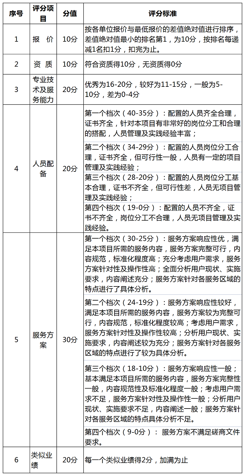 (二)会议评审。采购工作小组以报价、专业技术及服务能力、服务方案等因素,按照综合评分法经过打分后按照得分高低确定中标单位(其中报价10分、资质10分、专业技术及服务能力10分、人员配备20分、服务方案30分、类似业绩20分),并在云南农业农村厅网站进行公示。