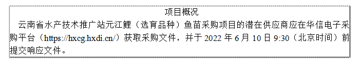 云南省水产技术推广站元江鲤(选育品种)鱼苗采购项目询价采购公告