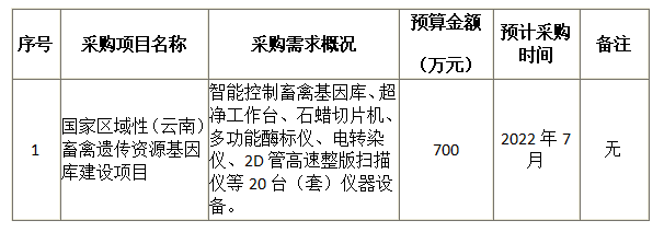 云南省畜牧兽医科学院2022年7月(至)2022年8月政府采购意向