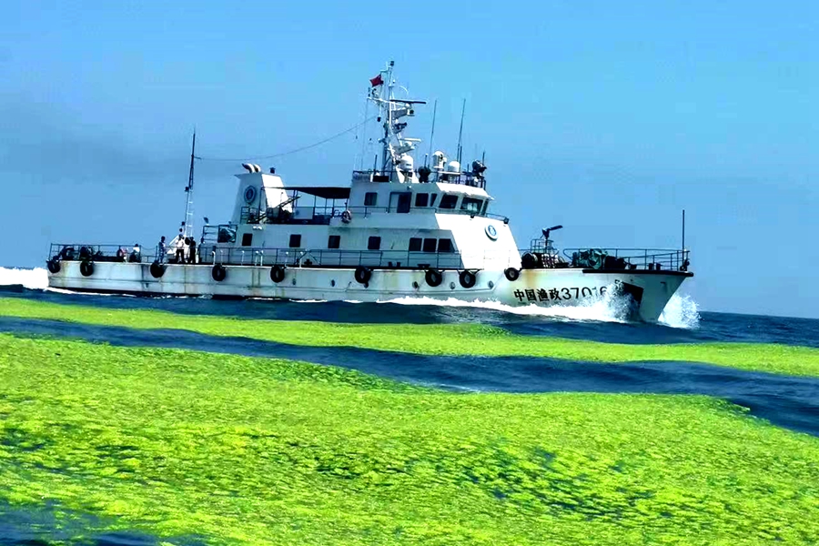 山东遭受浒苔绿潮侵袭,渔船成为打捞主力军