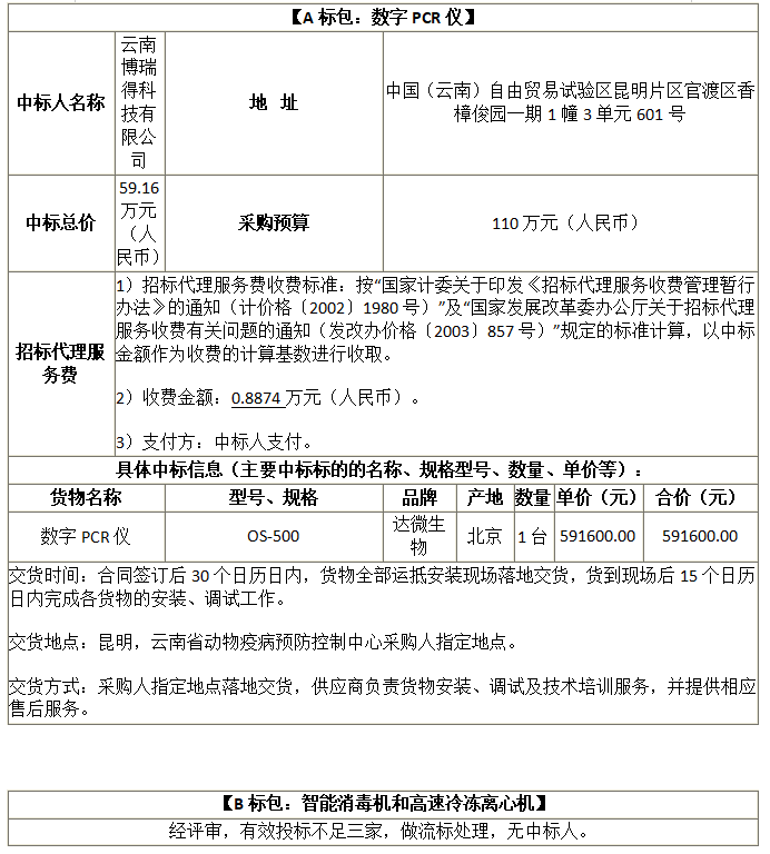 云南省动物疫病预防控制中心2022年省级动物疫病治理项目兽医实验室用仪器采购中标公告