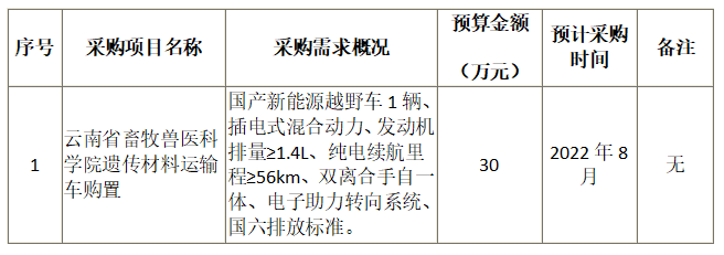 云南省畜牧兽医科学院遗传材料运输车购置2022年8月(至)2022年9月政府采购意向