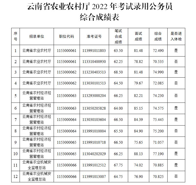 根据《云南省2022年度考试录用公务员公告》安排,笔试、面试工作已经结束,现将报考云南省农业农村厅(含云南省农村经济经营管理站、云南省农业机械安全监理总站)考生综合成绩及后续工作安排公告如下。