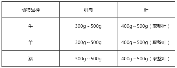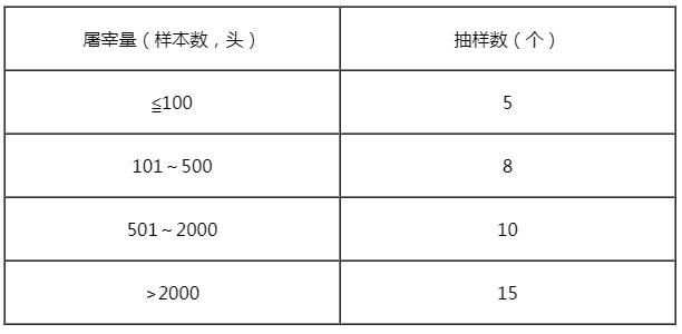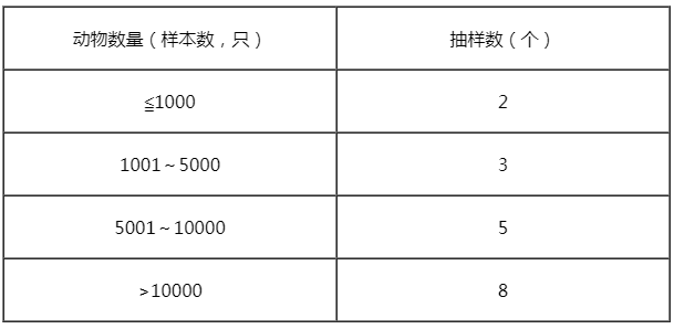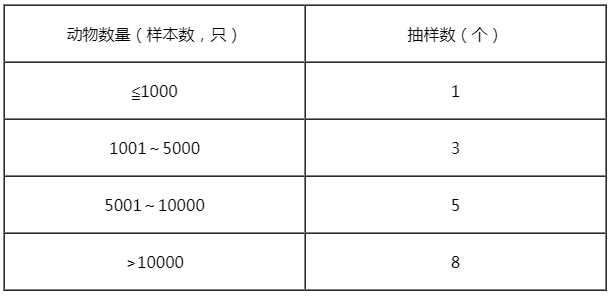 按《动物及动物产品兽药残留监控抽样规范》(NY/T 1897-2010)规定执行。畜禽产品每个县抽取样品不超过20个。家畜类产品在屠宰加工厂抽样:在屠宰线上,根据屠宰厂的规模,按屠宰数量抽样。同一检疫证号的同类产品抽取样品不得超过2个,同一屠宰加工厂每次抽取的样品总数不得超过6个。禽蛋样品在养殖场抽样,从禽舍或者周转库上抽取,取样量不少于6-10枚。每个养殖场同类产品不超过2个样品,有不同类型产品时,每次抽样的样品总数不得超过6个。根据动物饲养基数计算抽样数,禽肉样品在屠宰加工厂或者养殖场抽取,在屠宰加工厂抽取按屠宰数量抽样,同一检疫证号的同类产品抽取样品量不得超过2个,有不同检疫证号或不同类型产品时,同一屠宰加工厂每次抽取的样品总数不得超过6个。在养殖场抽取则每个养殖场同类产品不超过2个样品,有不同类型产品时,每次抽取的样品总数不得超过6个。鸡蛋不少于6个、鸡肉(全部胸)不少于300g;猪肉、猪肝不少于300g;牛肉、羊肉不少于300g。当牛肉、羊肉、猪肉样品数量抽样不足时,可根据实际选择其他品种样品补足。