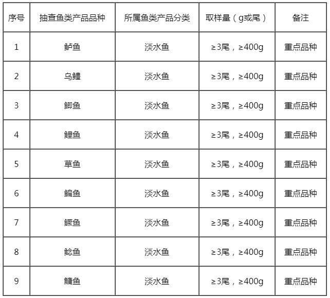 按《水产品抽样规范》(GB/T 30891-2014)规定执行。每个抽样单位同一养殖水体来源的同一品种样品只能抽取1个,同一养殖水体不同品种样品不超过2个,每个单位总共不超过3个。重点品种抽样数量不低于样品总量的80%,抽取样品数量的可食用部分不少于400g。