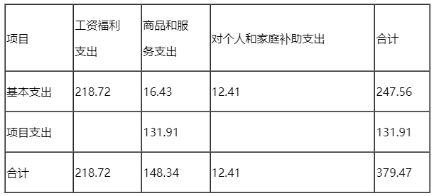 2020年决算总支出401.09万元,其中:基本支出266.28万元,占总支出的66.39%。基本支出中:工资福利支出218.72元,占基本支出的82.14%;商品和服务支出31.08万元,占基本支出的11.67%;对个人和家庭的补助支出16.48万元,占基本支出的6.19%。项目支出134.81万元,占总支出的33.61%。项目支出中:商品和服务支出132.00万元,占项目支出的97.92%;资本性支出2.81万元,占项目支出的2.08%。