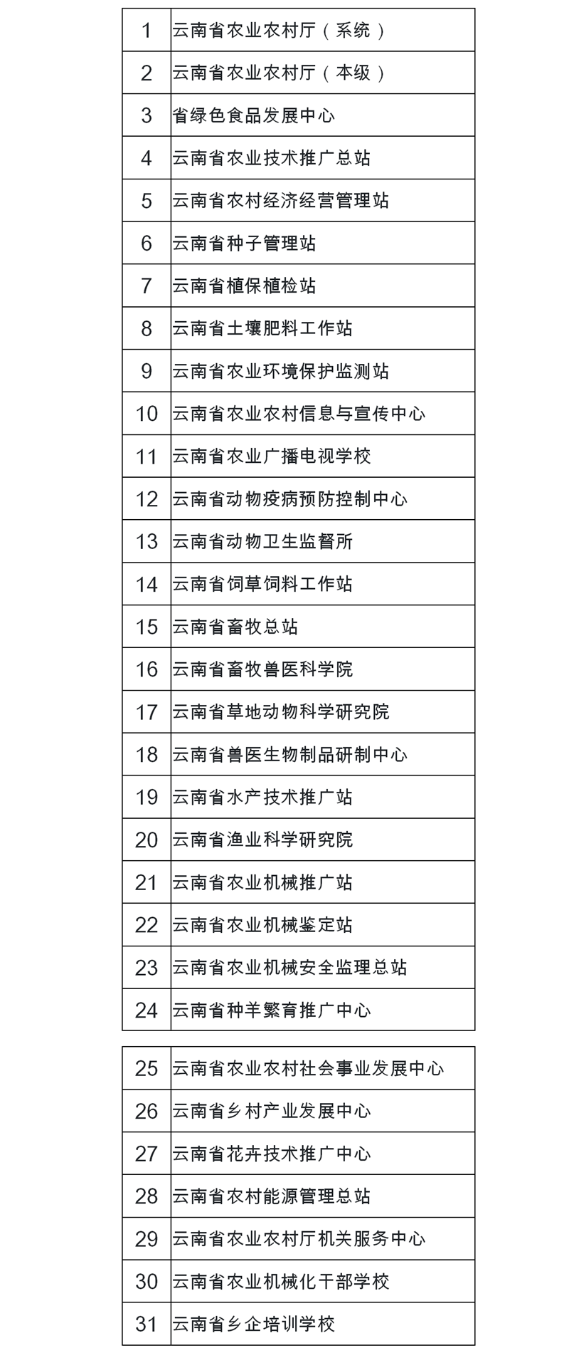 纳入云南省农业农村厅部门2021年度部门决算编报的单位共31个。其中:行政单位2个,参照公务员法管理的事业单位2个,其他事业单位27个。分别是: