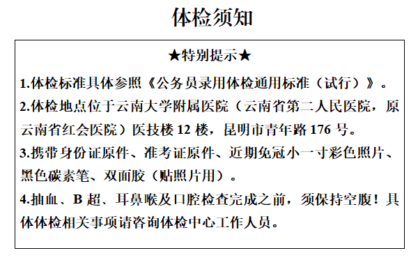 1.参加体检人员均须严格遵守国家和我省疫情防控相关规定,提前申请“云南健康码”和“通信大数据行程卡”,佩戴口罩,提供48小时内有效的核酸检测阴性证明。实时疫情防控要求按照昆明疫情防控政策执行。