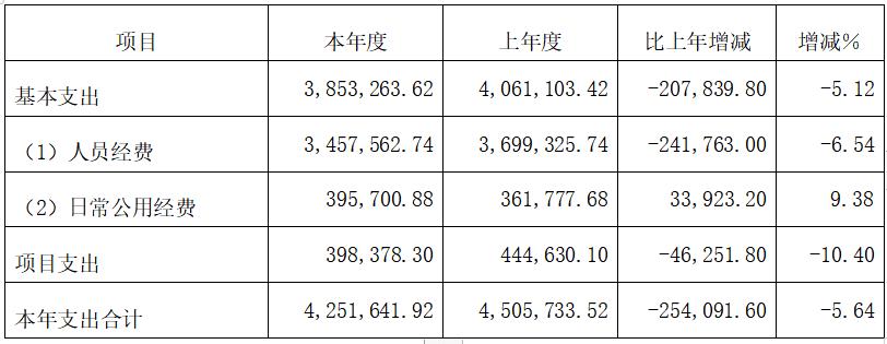 云南省农村经济经营管理站部门2021年度支出合计425.16万元。其中:基本支出385.33万元,占总支出的90.63%;项目支出39.84万元,占总支出的9.37%。与上年基本支出406.11万元相比减少20.78万元,减少率5.12%,减少主要原因是2021年在职职工调走2人,人员工资、津贴减少。项目支出与上年44.46万元相比减少4.62万元,减少主要原因是2021年减少了其他城乡社区支出和科技转化与推广服务两个项目,项目经费减少。