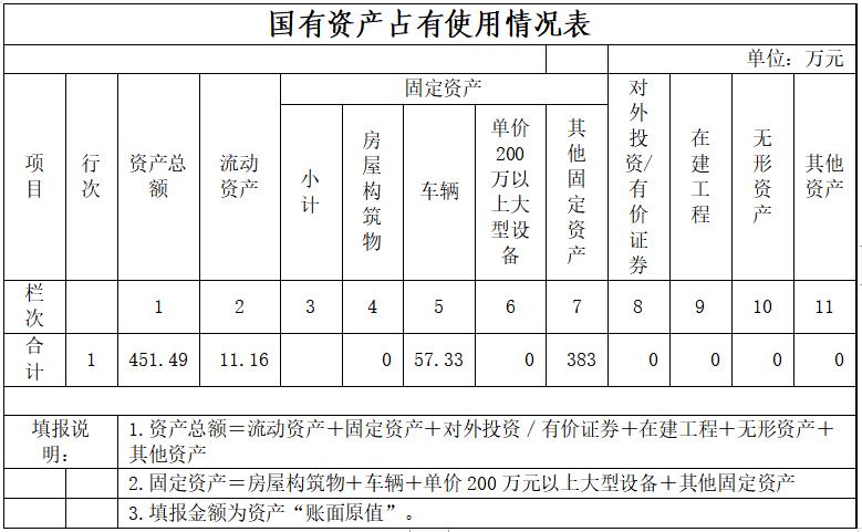 截至2021年12月31日,云南省动物卫生监督所部门资产总额451.49万元,其中,流动资产11.16万元,固定资产440.33万元,对外投资及有价证券0万元,在建工程0万元,无形资产0万元,其他资产0万元(具体内容详见附表)。与上年相比,本年资产总额减少0.57万元,其中流动资产减少1.07万元,固定资产增加0.5万元。处置房屋建筑物0平方米,账面原值0万元;处置车辆0辆,账面原值0万元;报废报损资产0项,账面原值0万元,实现资产处置收入0万元;出租房屋0平方米,账面原值0万元,实现资产使用收入0万元。