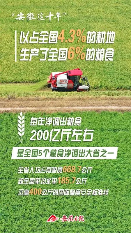 过去10年,安徽落实中央要求,毫不放松抓紧抓好粮食生产,产量已连续五年稳定在800亿斤以上,稳居全国第4位,不仅有力支撑了全省经济社会发展大局,也为端稳中国饭碗持续贡献安徽力量。