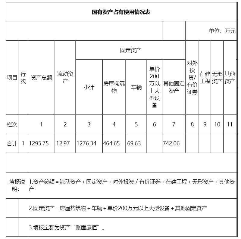 截至2021年12月31日,云南省土壤肥料工作站资产总额1295.75万元,其中,流动资产12.97万元,固定资产原值1276.34万元,对外投资及有价证券0万元,在建工程0万元,无形资产0万元,其他资产0万元(具体内容详见附表)。报废资产6.72万元。