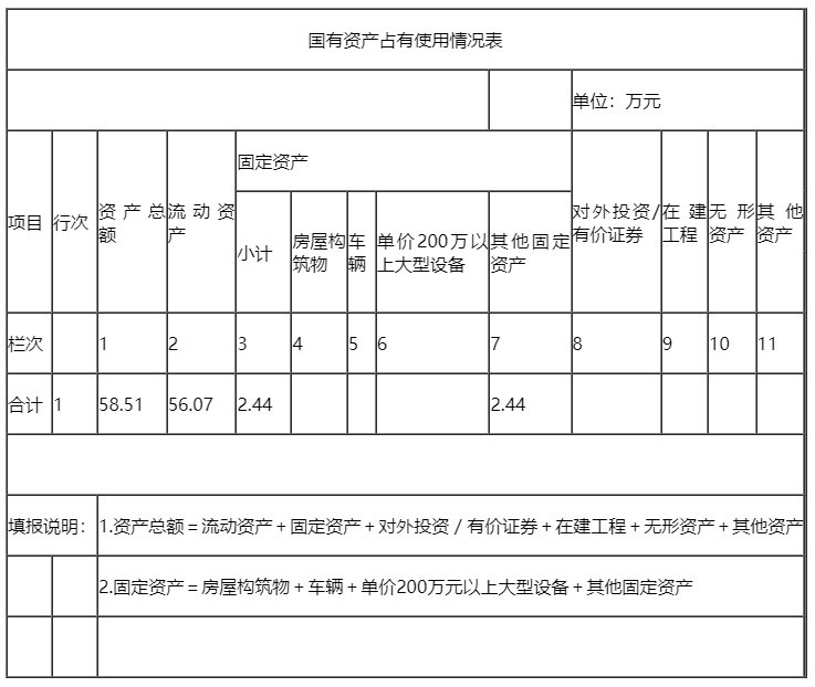 截至2021年12月31日,云南省农业机械化干部学校部门资产总额58.51万元,其中,流动资产56.07万元,固定资产2.44万元,无对外投资及有价证券,无在建工程,无无形资产,无其他资产。与上年相比,本年固定资产总额减少1.0万元,主要原因为固定资产计提折旧,导致资产减少。