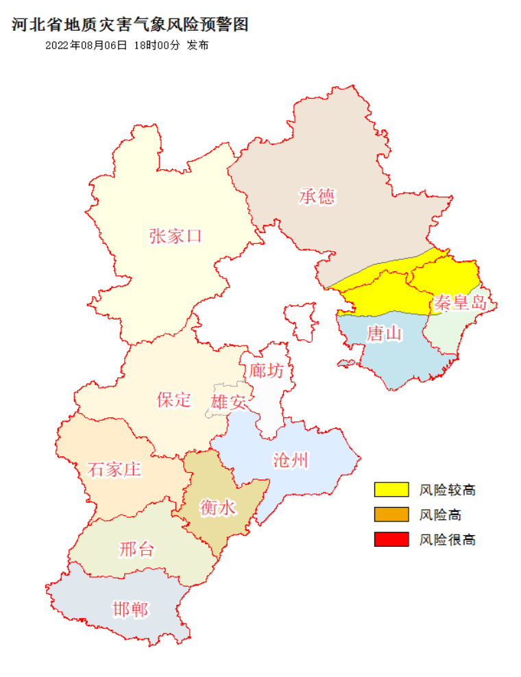 | 预警信息: | 自08月06日20:00至08月07日20:00,我省承德市(宽城县、兴隆县)、唐山市(迁西县、遵化市、迁安市、丰润区、玉田县)、秦皇岛市(卢龙县、青龙县、海港区、抚宁区)发生崩塌、滑坡、泥石流等地质灾害风险较高(黄色预警)。请上述地区有关责任单位和监测人员做好地质灾害监测、巡查、转移避险等防范工作。 | |||