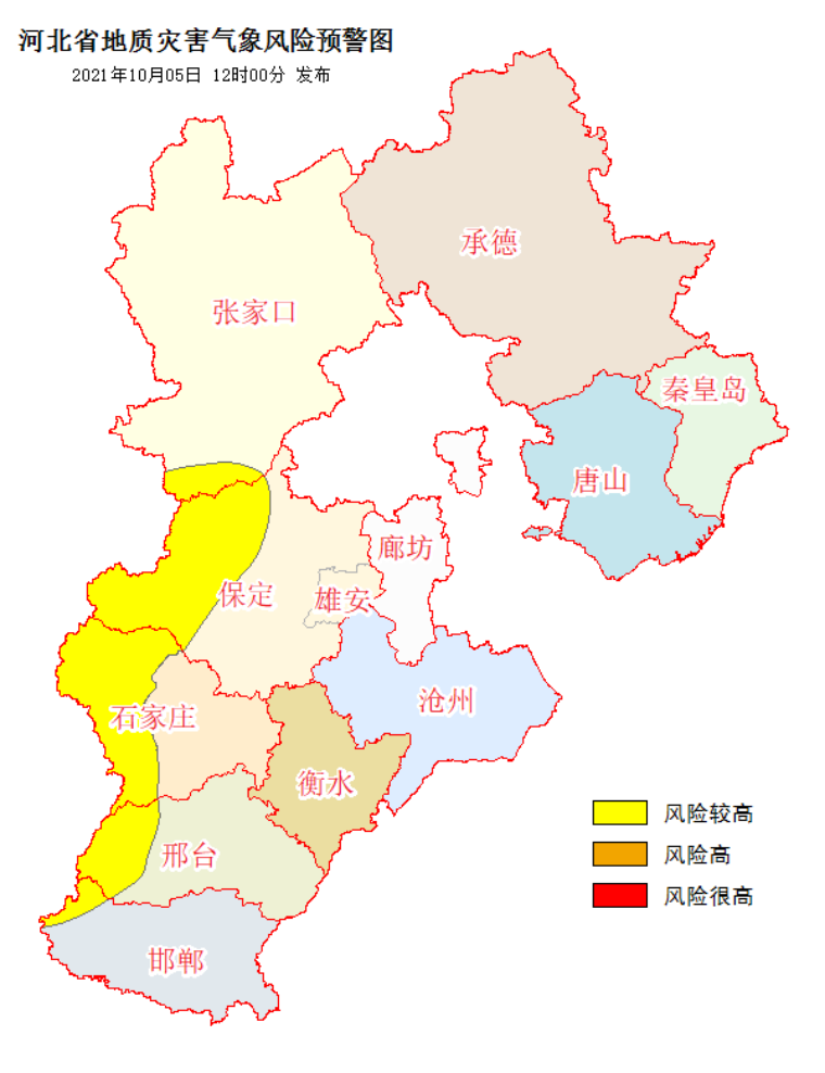 | 预警信息: | 自10月05日12:00至10月06日12:00,我省张家口市(涿鹿县、蔚县)、保定市(涞水县、涞源县、易县、阜平县、顺平县、唐县、曲阳县、满城区)、石家庄市(平山县、灵寿县、行唐县、井陉县、元氏县、赞皇县、鹿泉区)、邢台市(临城县、内丘县、沙河市、信都区)、邯郸市(武安市、涉县)发生崩塌、滑坡、泥石流等地质灾害风险较高(黄色预警)。请上述地区有关责任单位和监测人员做好地质灾害监测、巡查等防范工作。 | |||