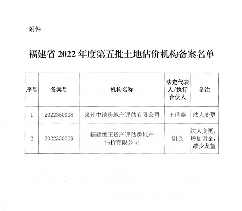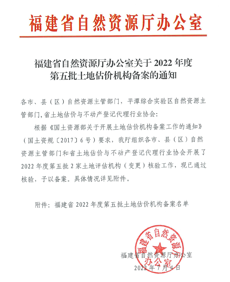 福建省自然资源厅办公室关于2022年度第五批土地估价机构备案的通知
