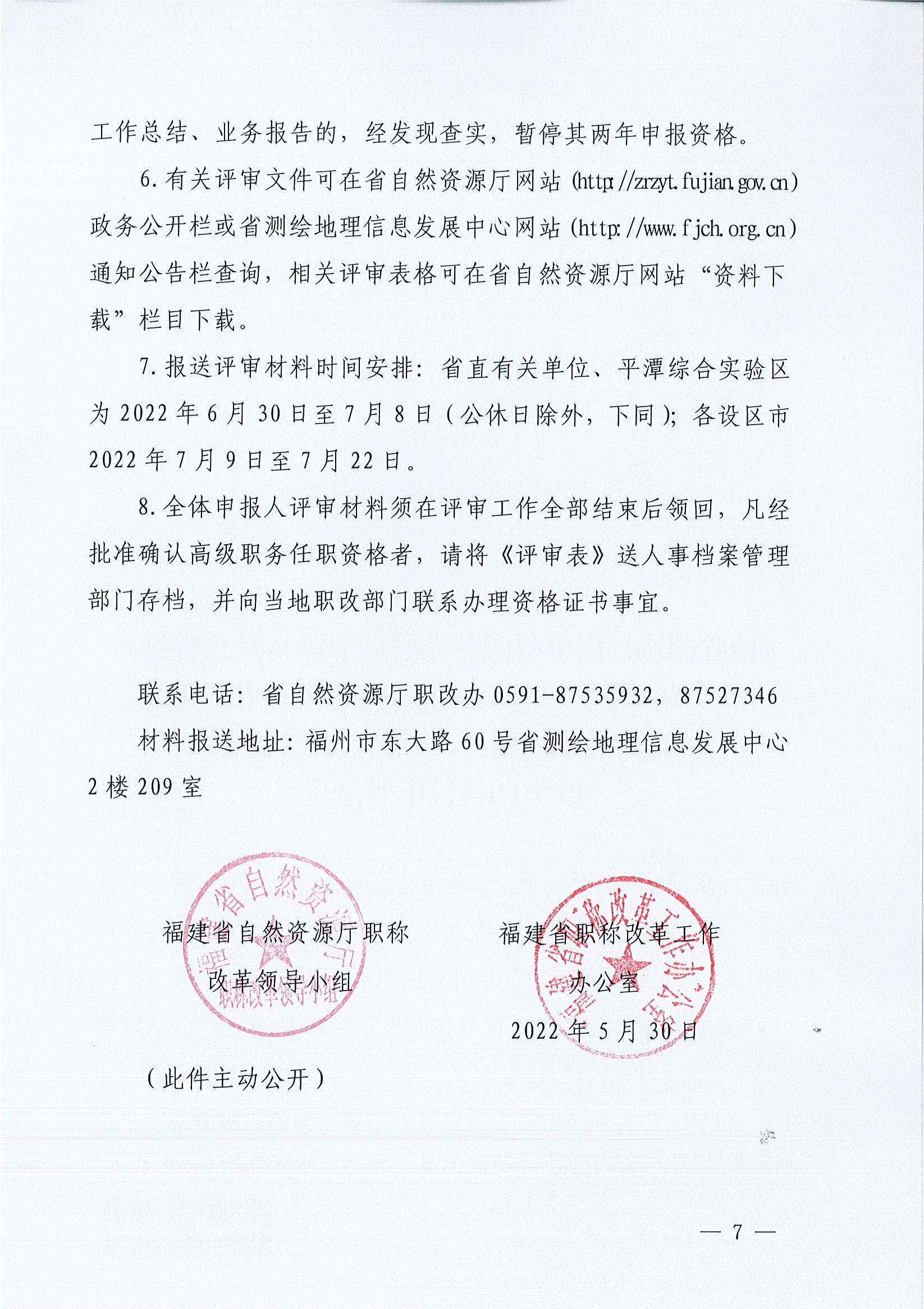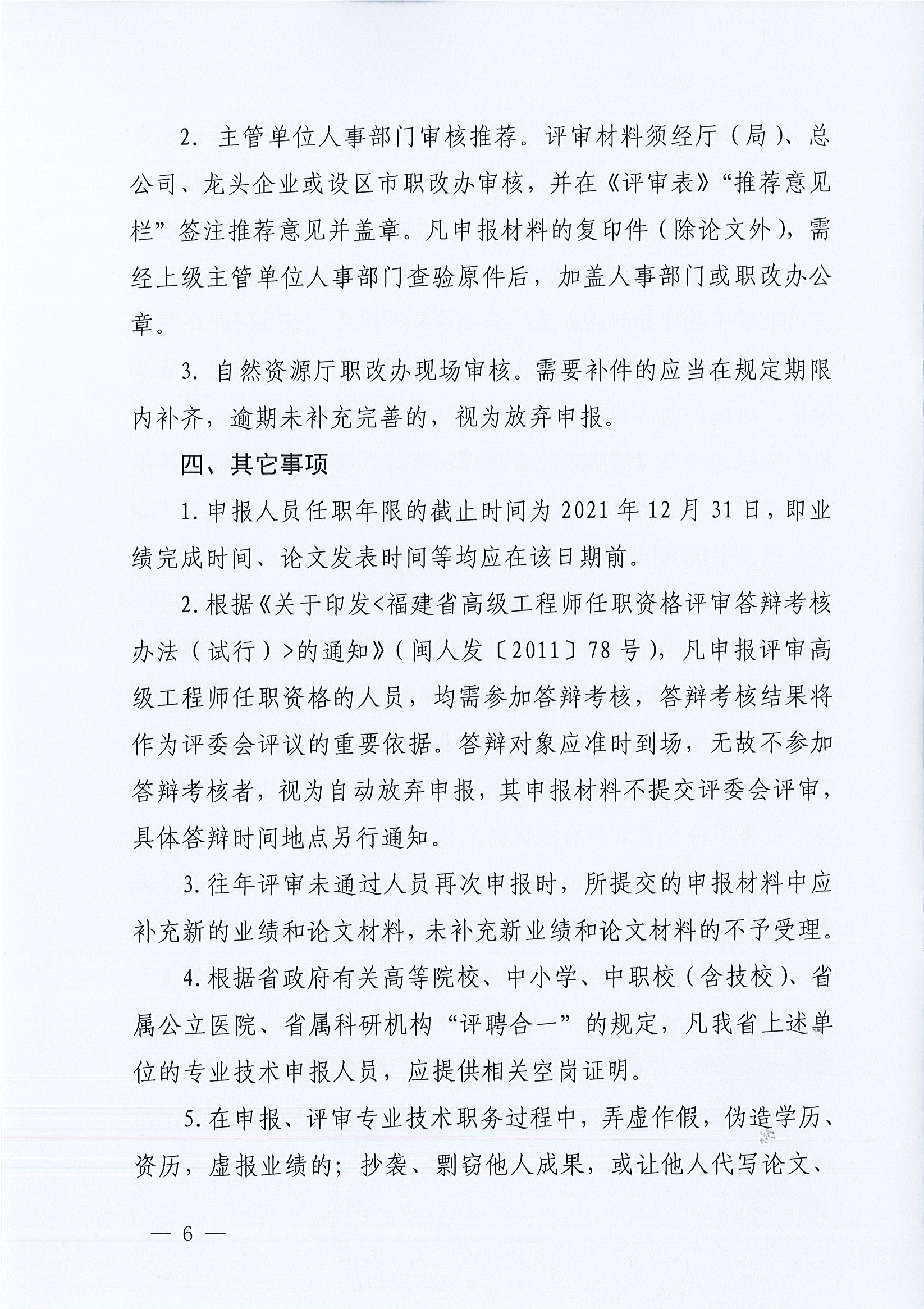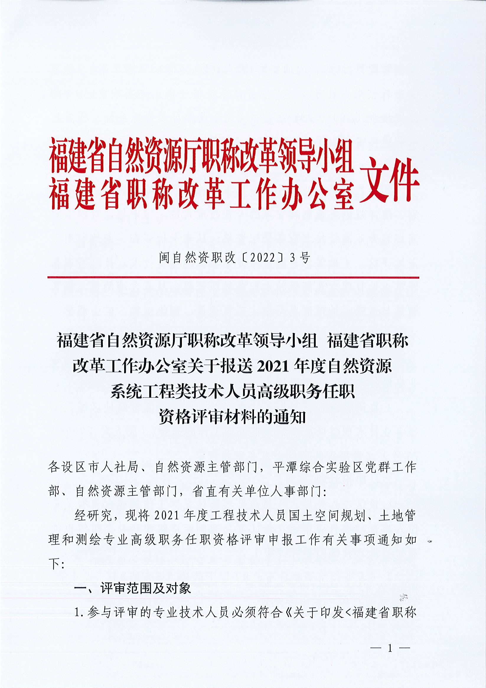 福建省自然资源厅职称改革领导小组福建省职称改革工作办公室关于报送2021年度自然资源系统工程类技术人员高级职务任职资格评审材料的通知