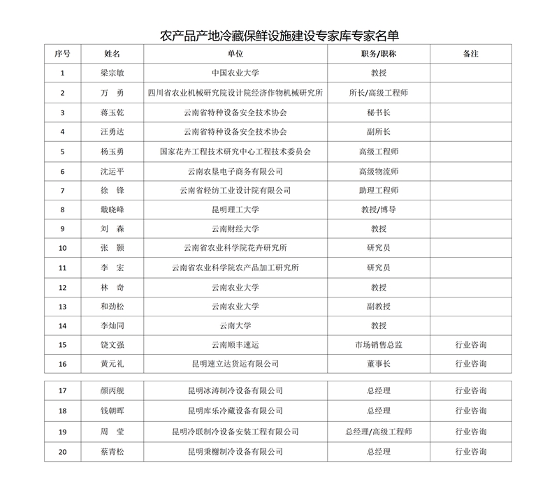云南省农业农村厅办公室关于建立农产品产地冷藏保鲜设施建设专家库的通知