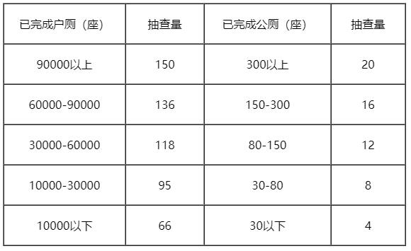 评估对象:对云南省农业农村厅指定的20个县(市、区)开展评估,以2019年以来完成改建的厕所为主要抽样评估对象,遵循客观、真实的原则,保证数据的准确性与真实性,采用分层抽样办法结合均匀分布概率进行样本抽选,覆盖到各县(市、区)内的所有乡(镇)、行政村。以县为单位暗访抽查样本个数可参照下表。