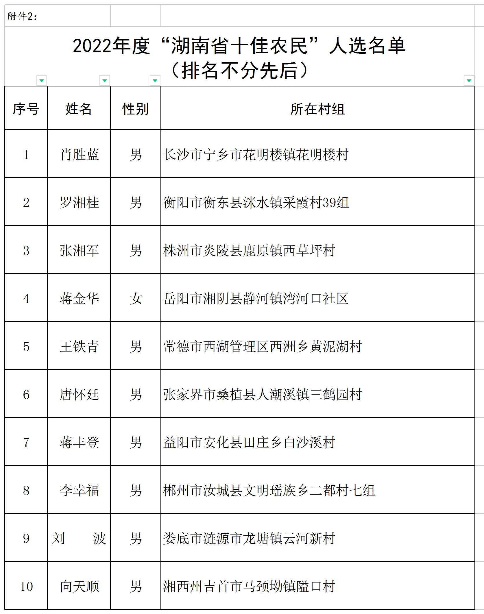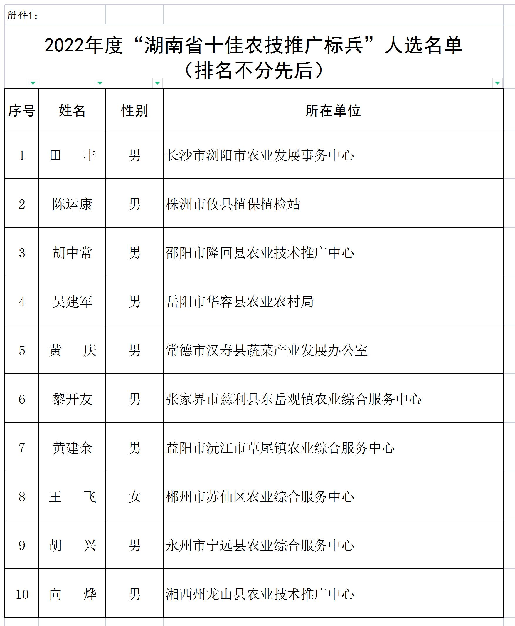 1、《2022年度“湖南省十佳农技推广标兵”人选名单》