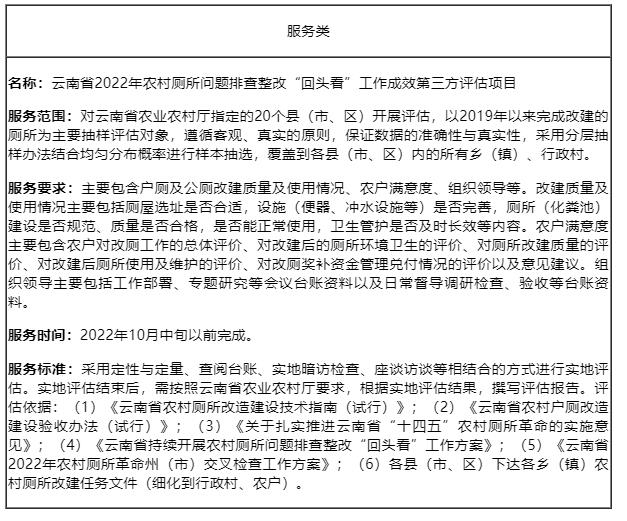 二、项目名称:云南省2022年农村厕所问题排查整改“回头看”工作成效第三方评估项目。