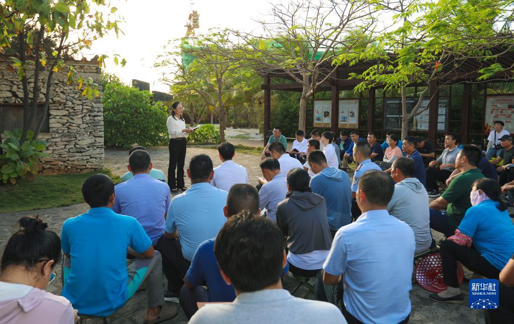 11月17日,党的二十大代表、海南陵水黎族自治县文罗镇副镇长、五星村党总支书记黄丽萍在三沙市赵述岛宣讲党的二十大精神。新华社发(吴亚铁摄)