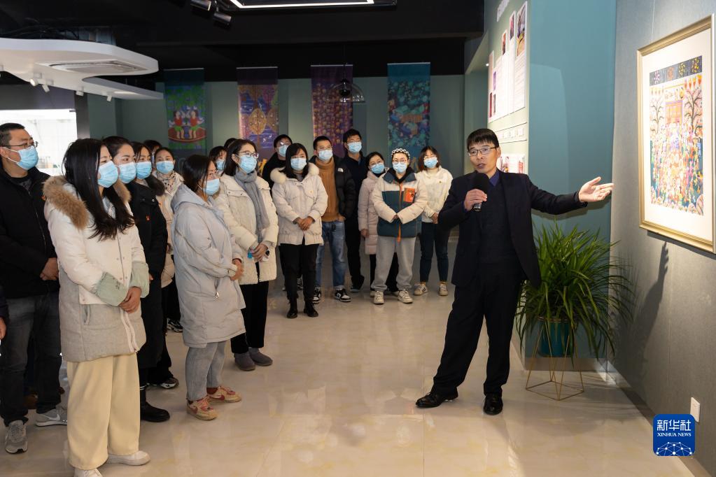 12月4日,江苏省南京市六合区农民画美术馆内,一场以江苏省非物质文化遗产六合农民画为载体的党的二十大精神宣讲会举行。这是六合区冶山街道文体服务中心主任胡斌(右一)带领参加活动的基层干部群众参观农民画。新华社发 (张梦 摄