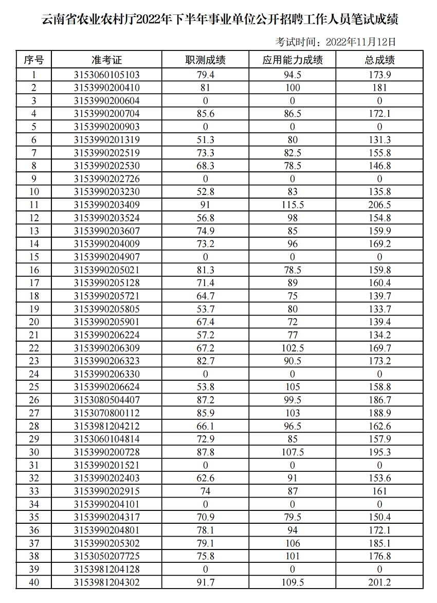 根据《云南省农业农村厅2022年事业单位公开招聘工作人员公告》要求,现将云南省农业农村厅2022年下半年事业单位公开招聘工作人员笔试成绩进行公告。考生可根据准考证号,可在全国人事考试服务平台(http://zp.cpta.com.cn/tyzpwb/?examid=dCdI)或本公告所附的《云南省农业农村厅2022年下半年事业单位公开招聘工作人员笔试成绩》中查询笔试成绩。在2022年12月9日前工作时间内,对考试成绩有疑问的可向云南省农业农村厅申请查疑,逾期不予受理。资格复审及相关后续事宜另行通知,考生可在云南省农业农村厅网站(https://nync.yn.gov.cn/)查看,请保持报名时登记的联系电话畅通。