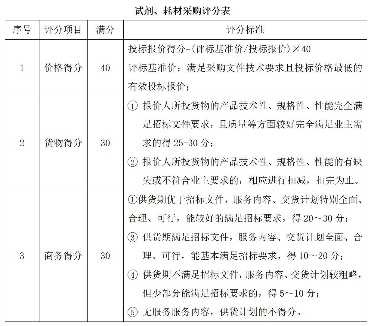 评标办法:采用“综合评分法”。指在最大限度地满足该次采购实质性要求前提下,按照招标文件中规定的各项因素进行综合评审后,按评标总得分的高低顺序推荐出1至3名中标候选人,具体评标办法详见《试剂、耗材采购评分表》。