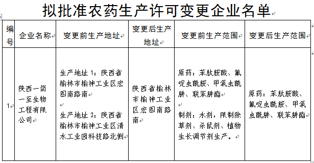 陕西省农业农村厅关于拟批准农药生产许可变更企业名单的公示