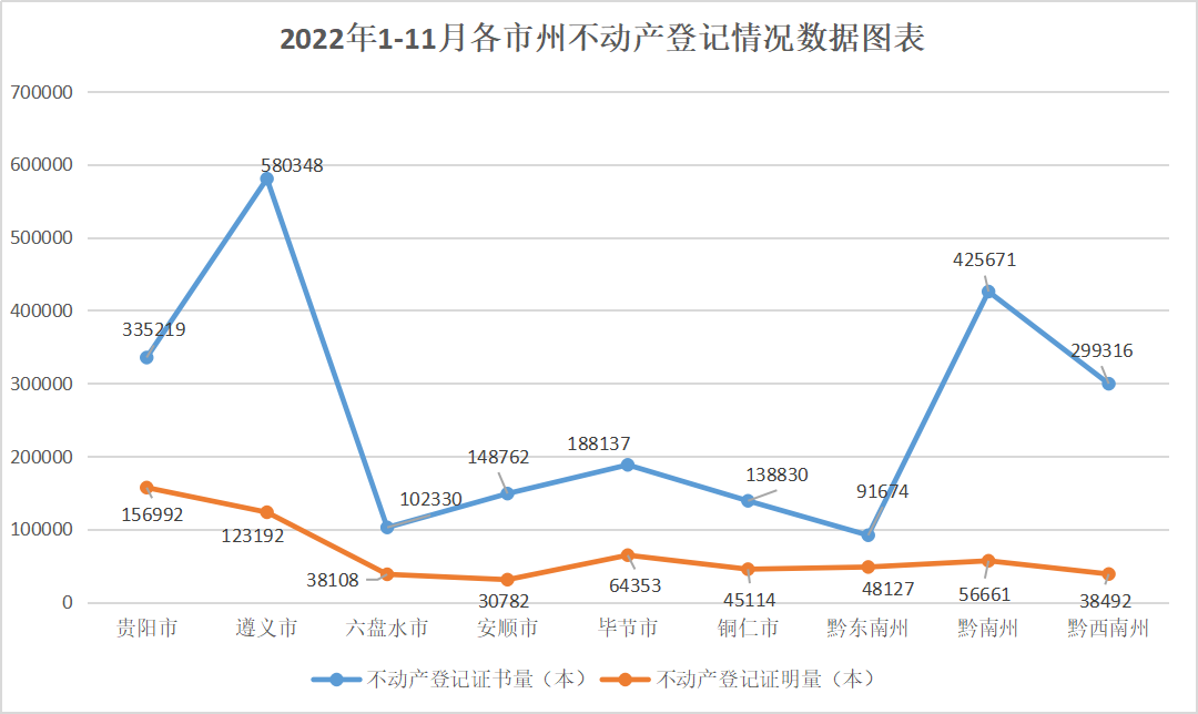 七、推进自然资源资产管理。指导市(州)做好第三次全国国土调查主要数据成果发布,9个市(州)和88个县(市、区、特区)均已发布“三调”主要数据公报。全面推进2021年度国土变更调查,制定全省实施方案,采取国家监测数据和省级自主提取、县级自主上传图斑相结合,共监测核查图斑93.85万个,配合国家外业调查队完成我省涉及的11个县国家级外业核查,完成国家第四次反馈的43个县数据库质量整改并上报国家。会同省林业局加快推进森林、草原、湿地调查监测,目前草原资源调查已完成标段验收;森林资源调查监测外业完成96%。有序推进2022年度地理国情监测,启动2022年度全国国土变更调查。制定贵州省自然资源调查监测体系构建实施方案,印发我省自然资源调查监测质量管理操作指南。配合省农业农村厅开展我省农业外来入侵物种普查。持续提升登记财产服务质量,明确2022年优化营商环境登记财产重点任务清单,制定全面实施不动产登记、交易和缴税线上线下一窗受理、并行办理工作方案,市场主体转让不动产基本实现1个工作日内办结;在全国率先完成“三年移交”军建住房不动产登记;督促推进贵阳市清理规范林权确权登记历史遗留问题试点;推进20个省级重点区域和40%的市、县重点区域自然资源统一确权登记外业调查;推进全省地籍区、地籍子区调整。1—11月,全省不动产登记业务总量420.93万次,发放不动产权证231.03万本、登记证明60.18万本。全面完成全民所有自然资源资产第二批试点,初步建立省级农用地、建设用地、矿产、林地、草地资源资产清查价格体系;完成省本级、铜仁市及所辖县(区)三级全民所有自然资源实物量清查成果质量检查汇交;对省级8种矿产资源资产及铜仁市全域全民所有自然资源开展实物量清查和经济价值估算;省市县三级资产清查成果已按要求汇交报部。统筹推进全民所有自然资源资产所有权委托代理机制试点,省委办公厅、省政府办公厅印发我省实施方案;省市两级自然资源清单经省政府审查后报部备案,正报请省政府办公厅按程序印发;制定省级试点34项重点任务分工方案,建立涵盖21个厅(局)和5个试点市(州)政府的省级联席会议制度,赴5个试点市(州)调研指导推动试点,并完成试点中期评估;形成自然资源清单研究等5个专题报告(初稿),各项试点任务正在积极推进。起草贵州省全民所有自然资源资产平衡表编制试点实施方案。完成贵州省2021年度国有自然资源资产管理情况专项报告编制。加强政府储备土地和贷款台账管理,开展贵阳市土地储备监测监管系统升级试点,启动编制2023年度土地储备计划,配合做好债务风险防范。协同做好有关系统资产上划、涉旅国企改革、国有农场改革土地资产处置等相关工作。