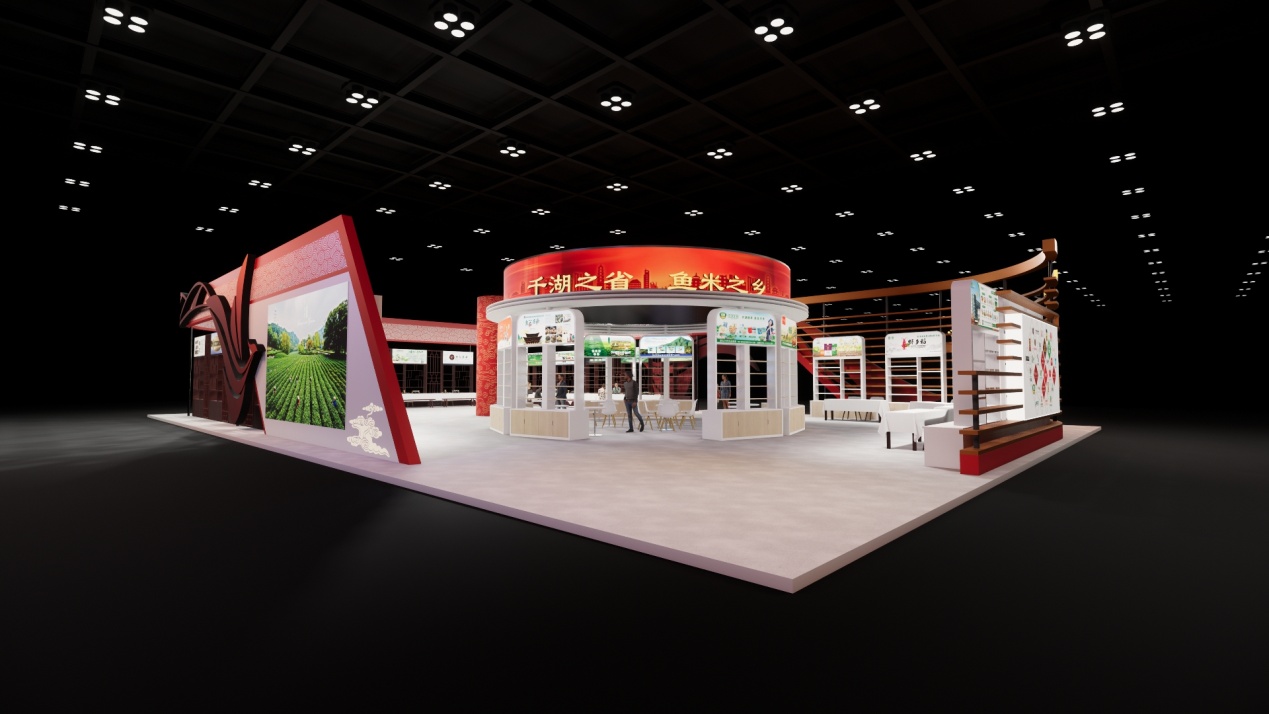 据了解,今年湖北省参加的省级综合展、市州展、农垦展、农民合作社展和大型农企展总参展面积3800㎡,其中省级综合展区面积585㎡。在展区整体设计上,重点突出荆楚文化特色与绿色资源禀赋,整体展台以楚凤和丹雀为主造型设计,融合湖北大江大河的水纹元素,深度阐释“千湖之省鱼米之乡”历史文化传承和品牌农业故事。