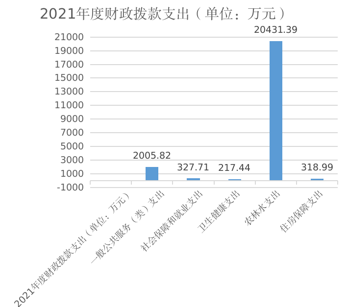 2021年度财政拨款支出23301.35万元,主要用于以下方面:一般公共服务(类)支出2005.82万元,占总支出8.61%;社会保障和就业支出327.71万元,占总支出1.41%;卫生健康支出217.44万元,占总支出0.93%;农林水支出20431.39万元,占总支出87.68%;住房保障支出318.99万元,占总支出1.37%。