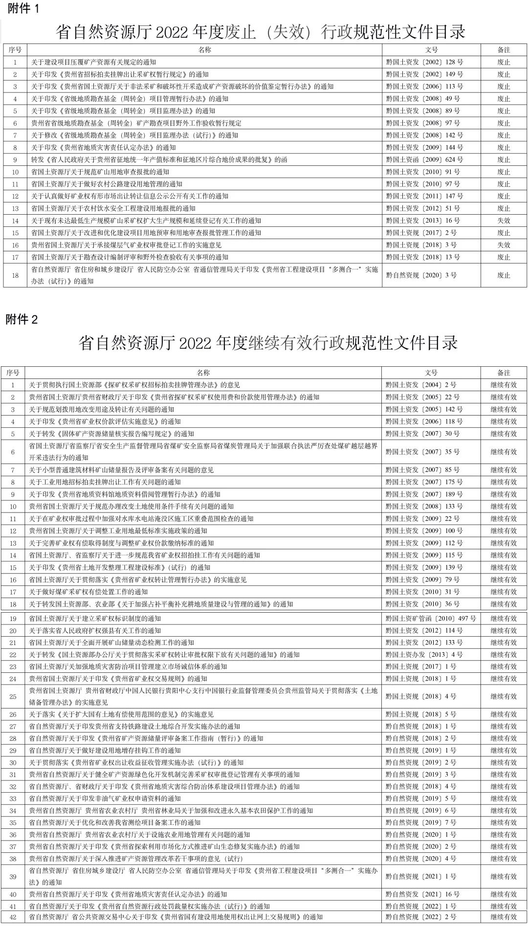 根据《贵州省行政规范性文件制定和监督管理规定》(黔府令192号)的规定,省自然资源厅开展了2022年度行政规范性文件清理工作,现将省自然资源厅2022年度废止(失效)和继续有效行政规范性文件目录予以公告。