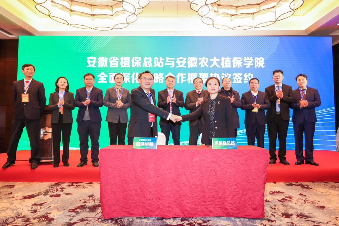 论坛期间,安徽省植保总站与安徽农业大学植物保护学院签订全面深化战略合作框架协议、与安徽省农科院植保质安所签订战略合作框架协议。