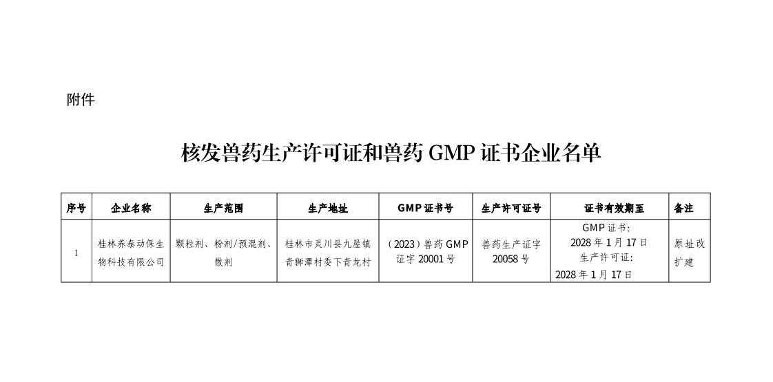 根据《兽药管理条例》《兽药生产质量管理规范(2020年修订)》《兽药生产质量管理规范(2020年修订)实施安排》(农业农村部公告第293号)以及《兽药生产质量管理规范检查验收办法》(农业部公告第2262号)规定,经现场检查验收、审核,桂林养泰动保生物科技有限公司符合兽药GMP要求和生产许可核发条件,现予核发兽药生产许可证和兽药GMP证书。
