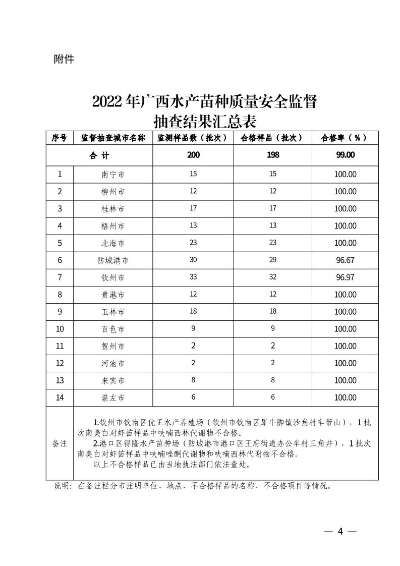 自治区农业农村厅办公室关于2022年广西水产苗种质量安全监督抽查结果的通报(桂农厅办发〔2023〕2号)