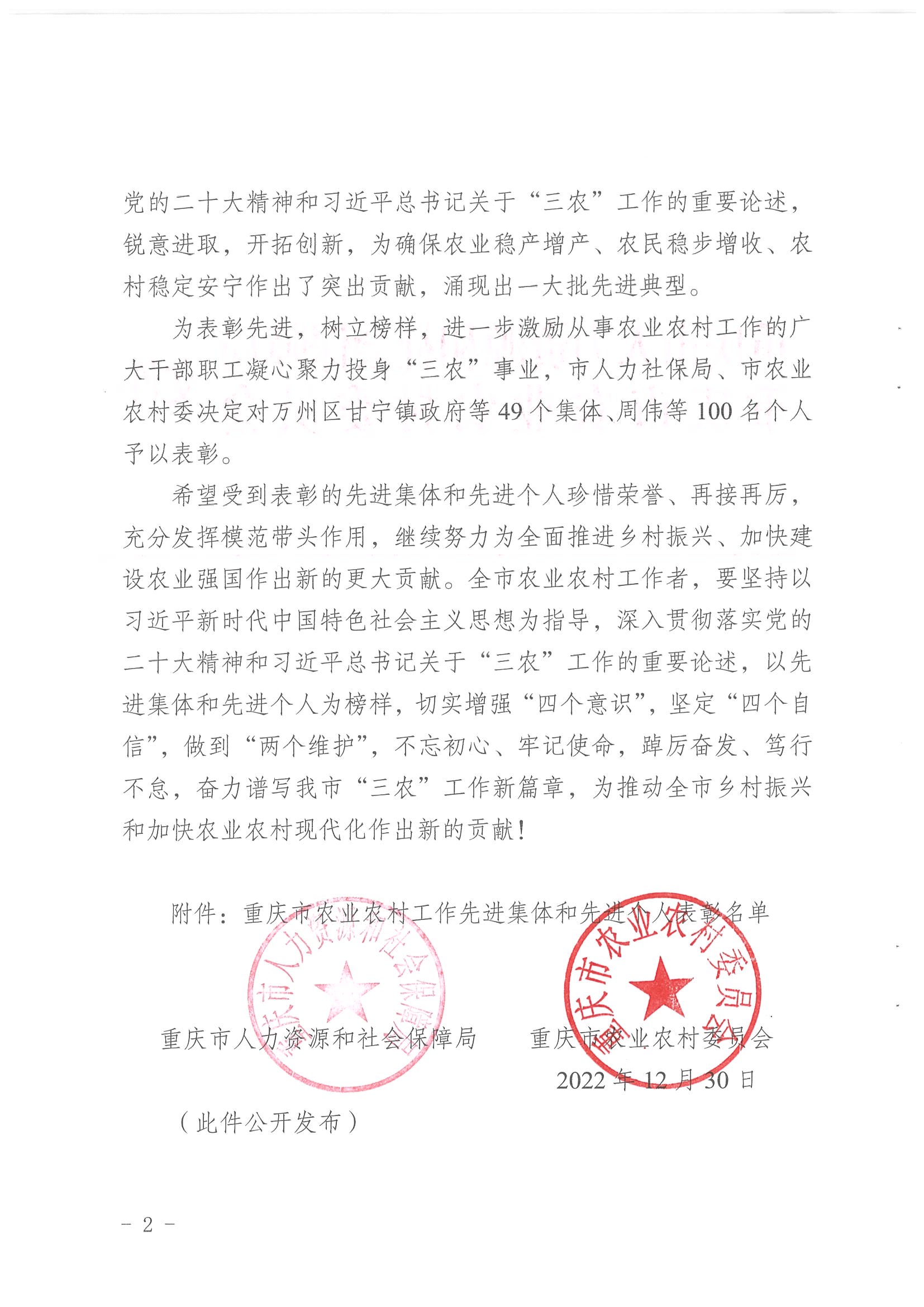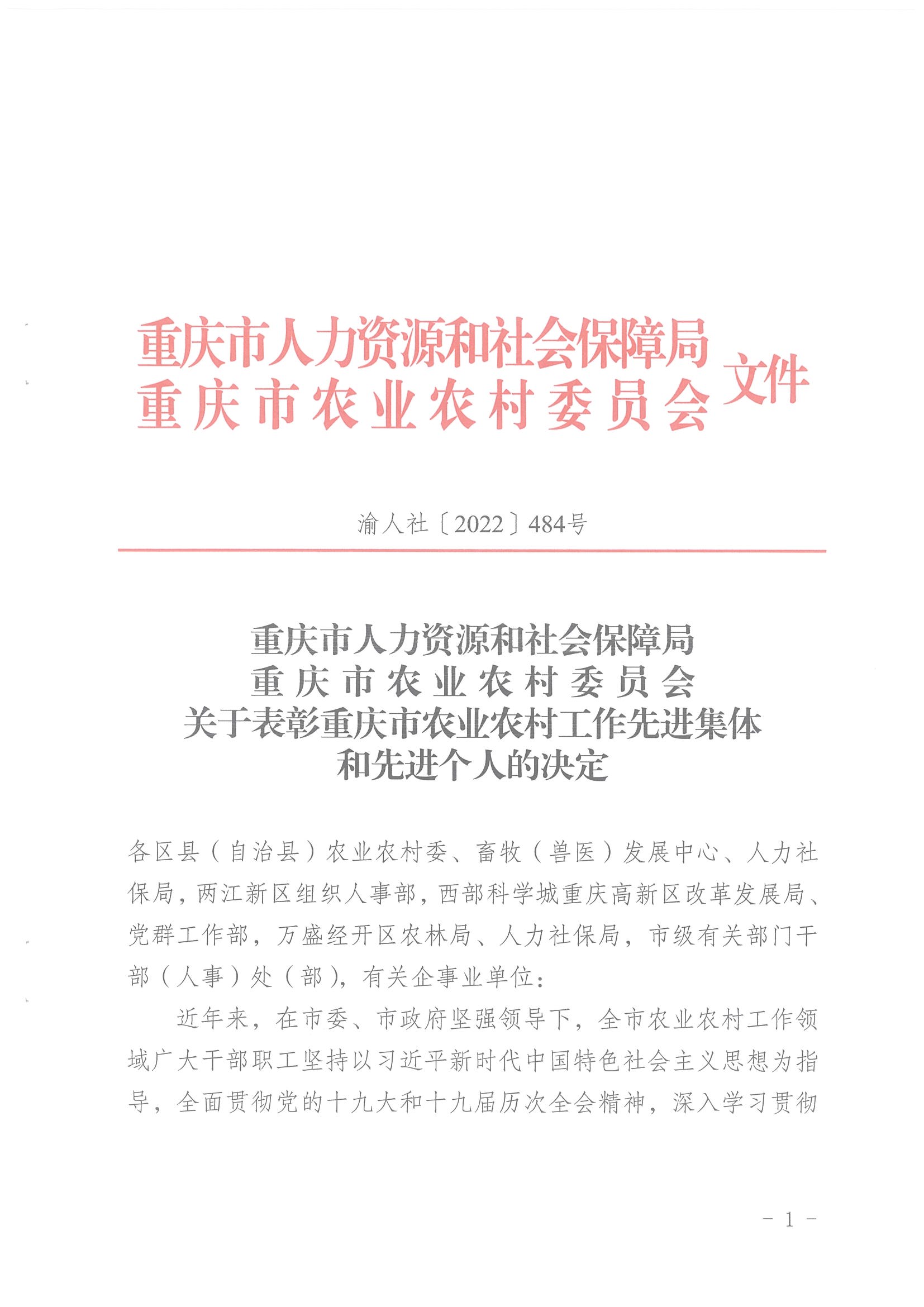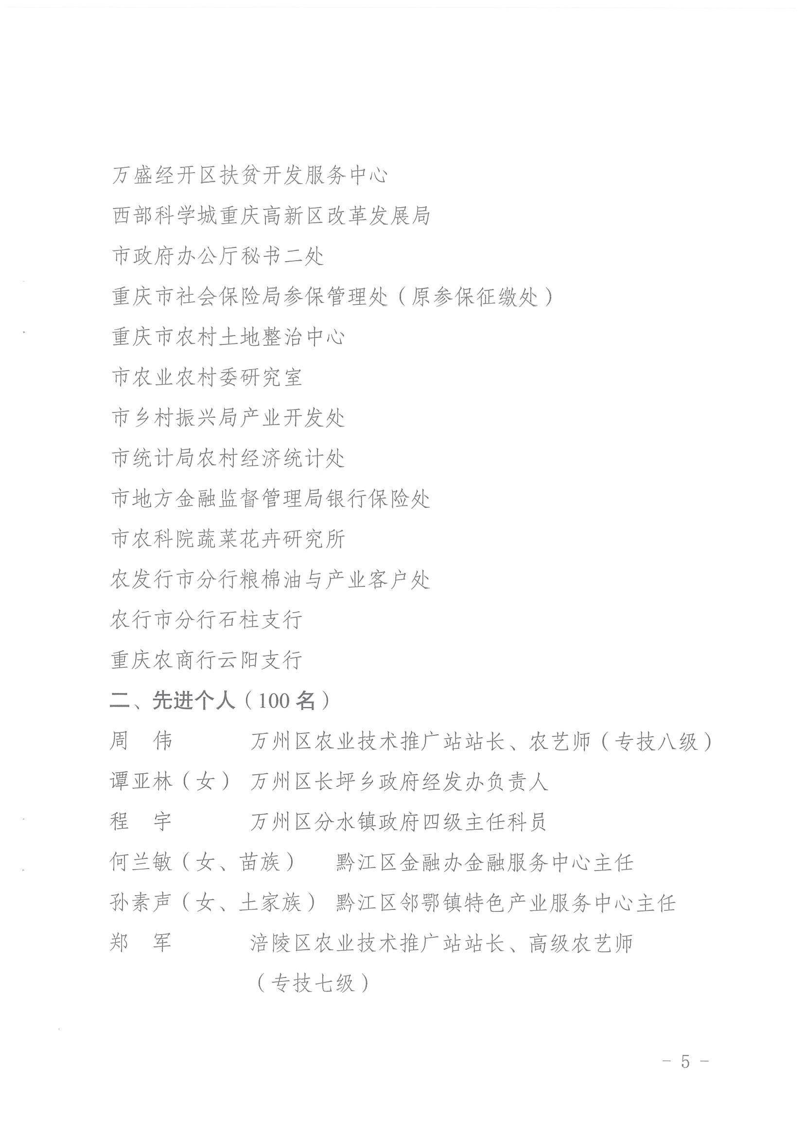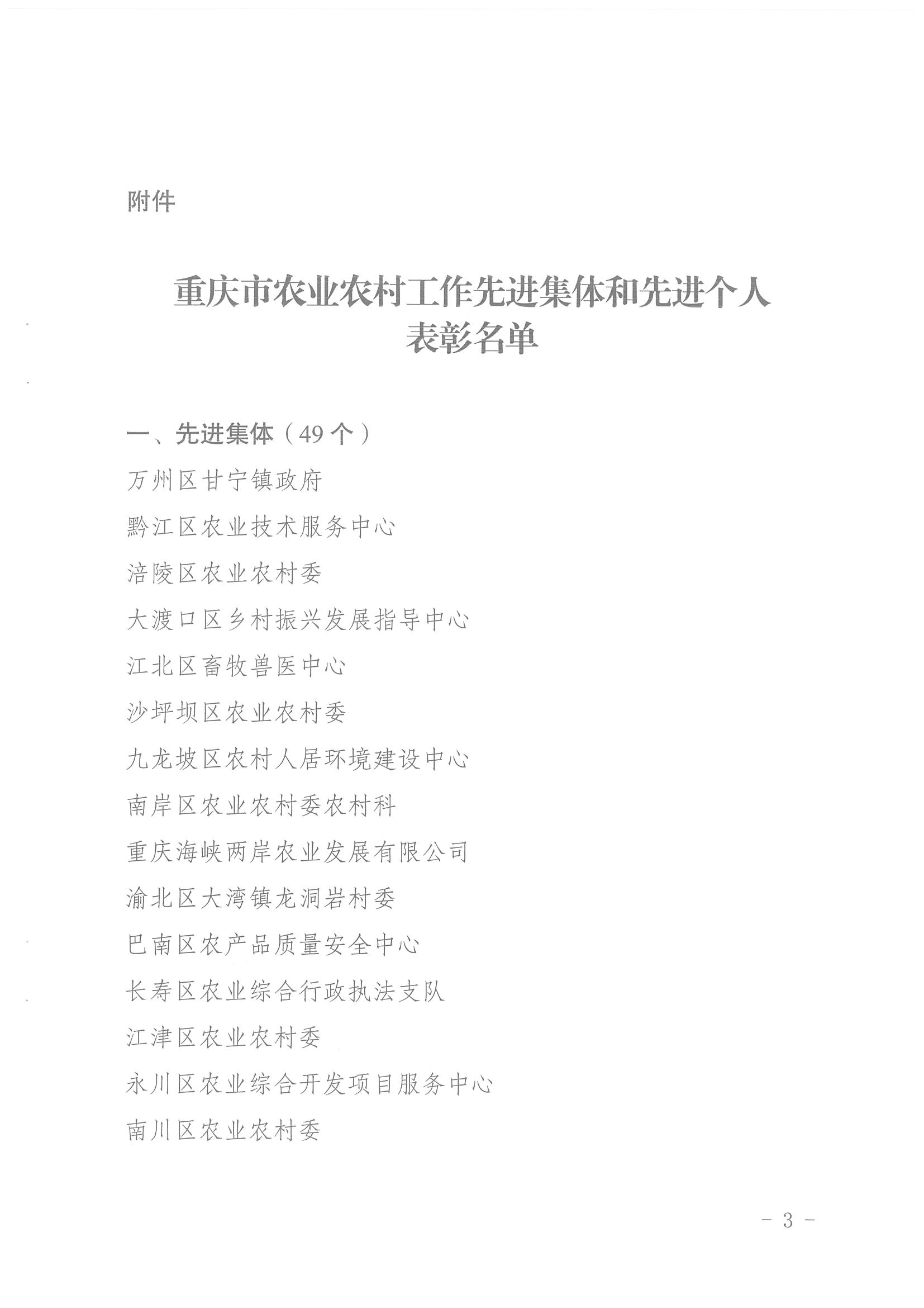 重庆市人力资源和社会保障局 重庆市农业农村委员会关于表彰重庆市农业农村工作先进集体和先进个人的决定