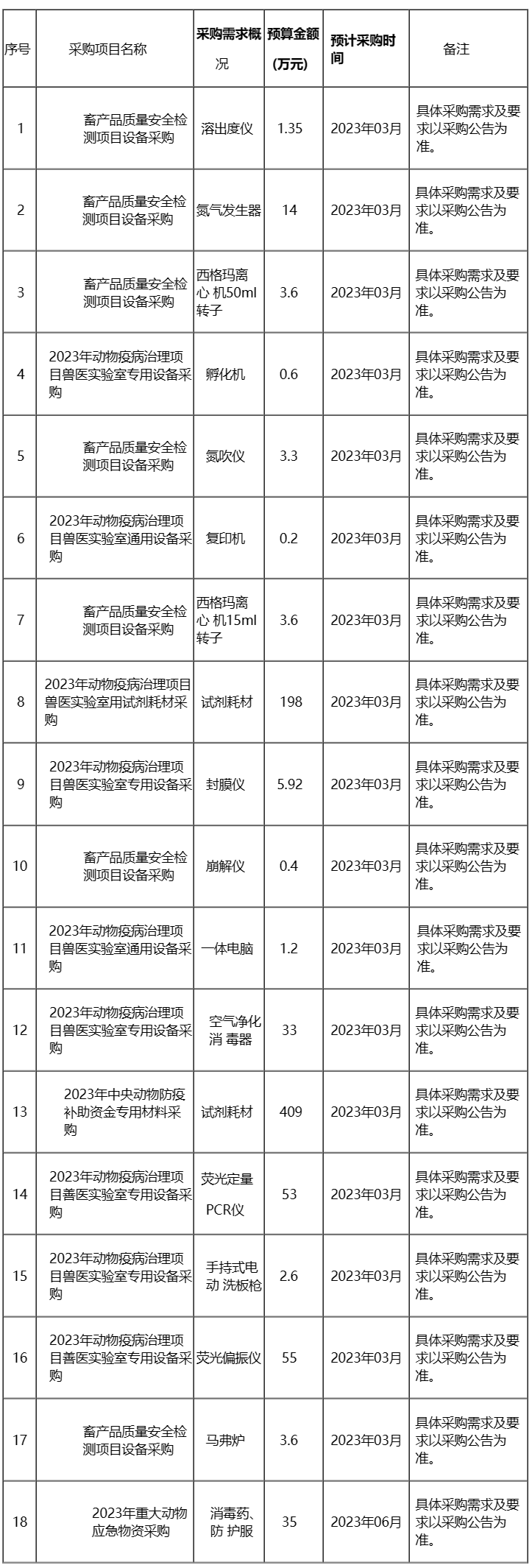 为便于供应商及时了解政府采购信息,根据《财政部关于开展政府采购意向公开工作的通知》(财库〔2020〕10号)等有关规定,现将云南省动物疫病预防控制中心2023年3月(至)2023年6月政府采购意向公开如下: