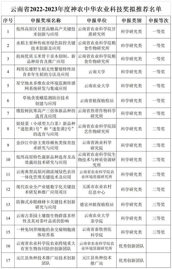 云南省农业农村厅关于云南省2022—2023年度神农中华农业科技奖拟推荐名单的公示