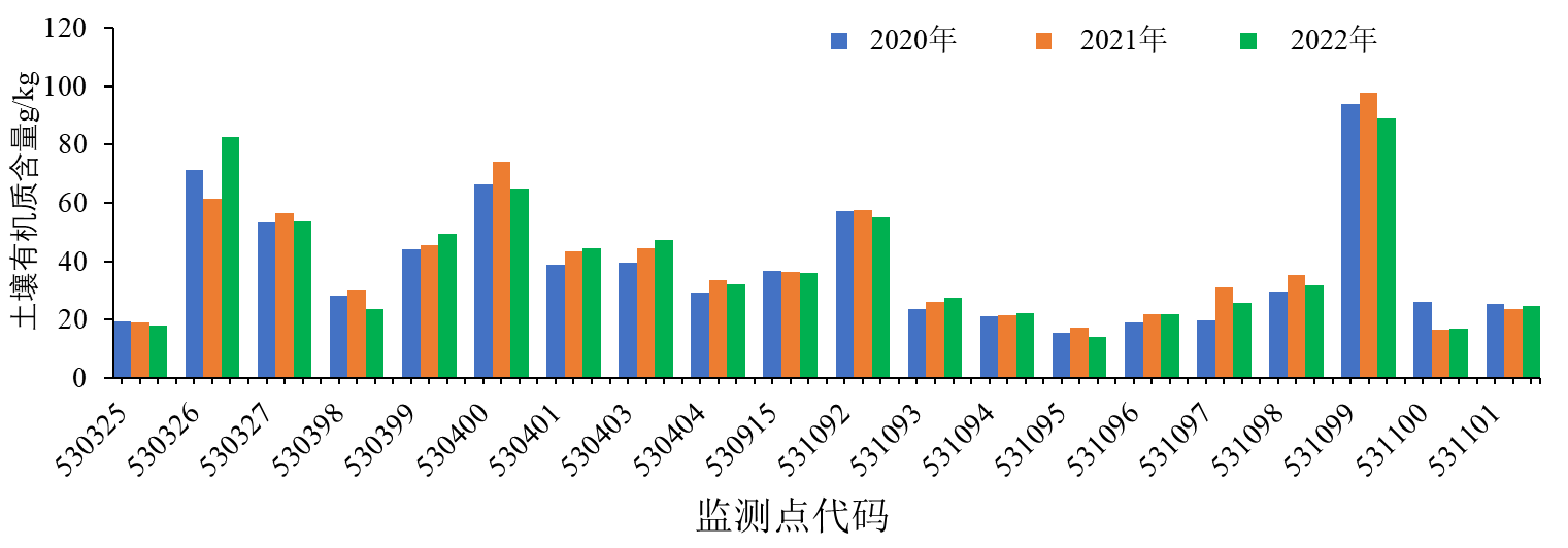 与2020年、2021年相比,2022年监测点有机质总体稳定,略有波动(图9)。2020年、2021年和2022年土壤有机质的平均值分别为37.9g/kg、39.6g/kg和39.3g/kg。其中,530399(思茅区南屏镇整碗村)、530401(临翔区博尚永泉)、530403(广南县旧莫乡昔板村)、531093(盐津县牛寨乡敦厚村)、531096(华宁县青龙镇大村)监测点的有机质有逐年上升趋势;530325(景东县锦屏景范)监测点有机质有逐年下降趋势;其他监测点有机质变化趋势不明显,呈波动变化。