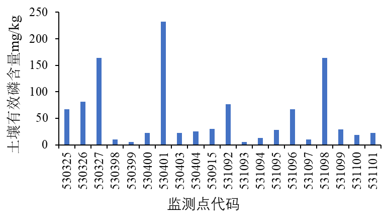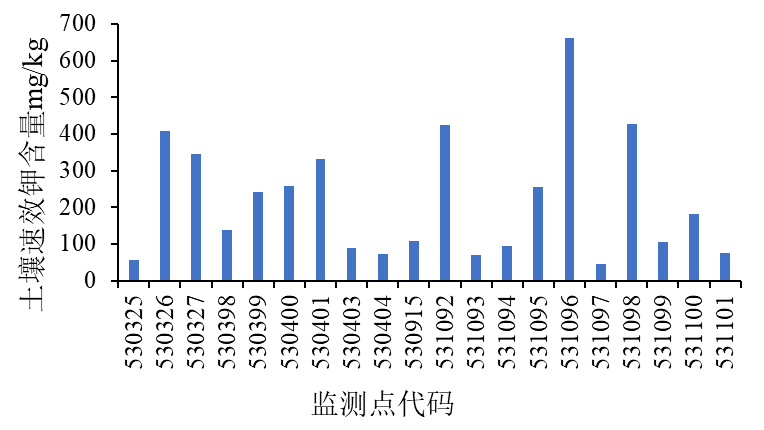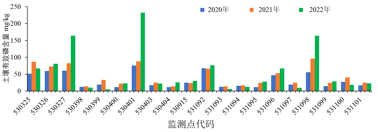与2020年、2021年相比,2022年监测点土壤有效磷含量平均值有所提高(图12)。2020年、2021年和2022年土壤有效磷平均值分别为31.5mg/kg、42.2mg/kg和54.62mg/kg。2022年比2020年、2021年分别提高74%和29%。其中,530326(临翔区博尚讯房)、530327(麒麟区越州)、530401(临翔区博尚永泉)、531092(昭阳区太平)、531096(华宁县青龙镇)、531098(施甸县水长乡)等旱地红壤的有效磷含量较高,且变化幅度较大,其他类型土壤的有效磷含量相对较低,变幅也较小。
