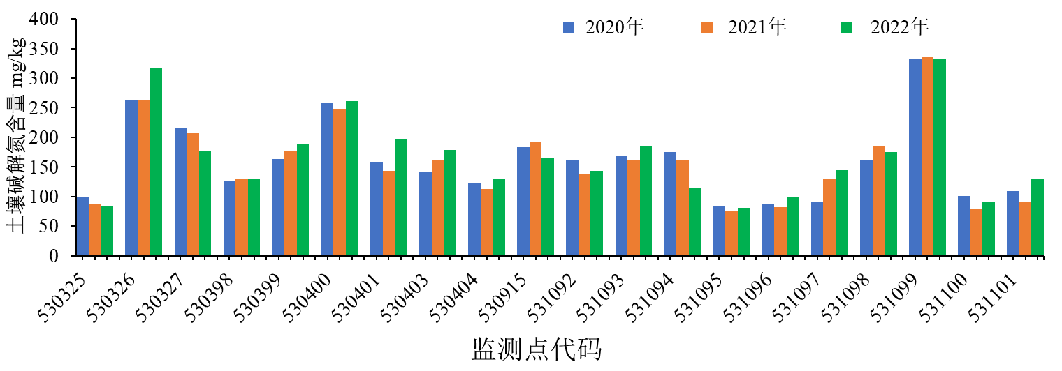 与2020和2021年相比,2022年监测点碱解氮比较稳定(图11)。其中,2020年、2021年和2022年土壤碱解氮的平均值分别为160mg/kg、158mg/kg和166mg/kg,变化趋势不明显。